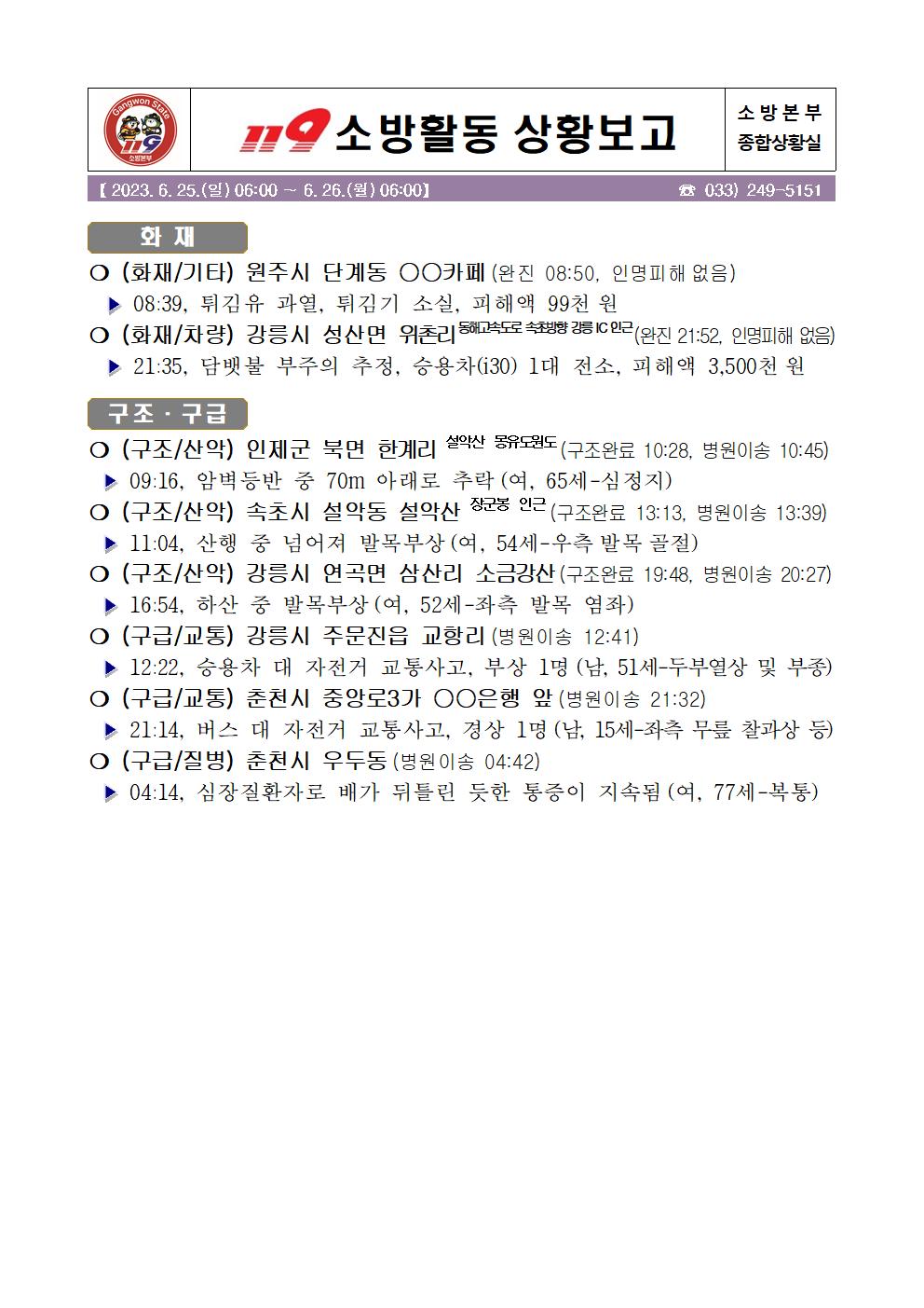 119 소방활동 일일상황보고(6.26.월) 06:00
