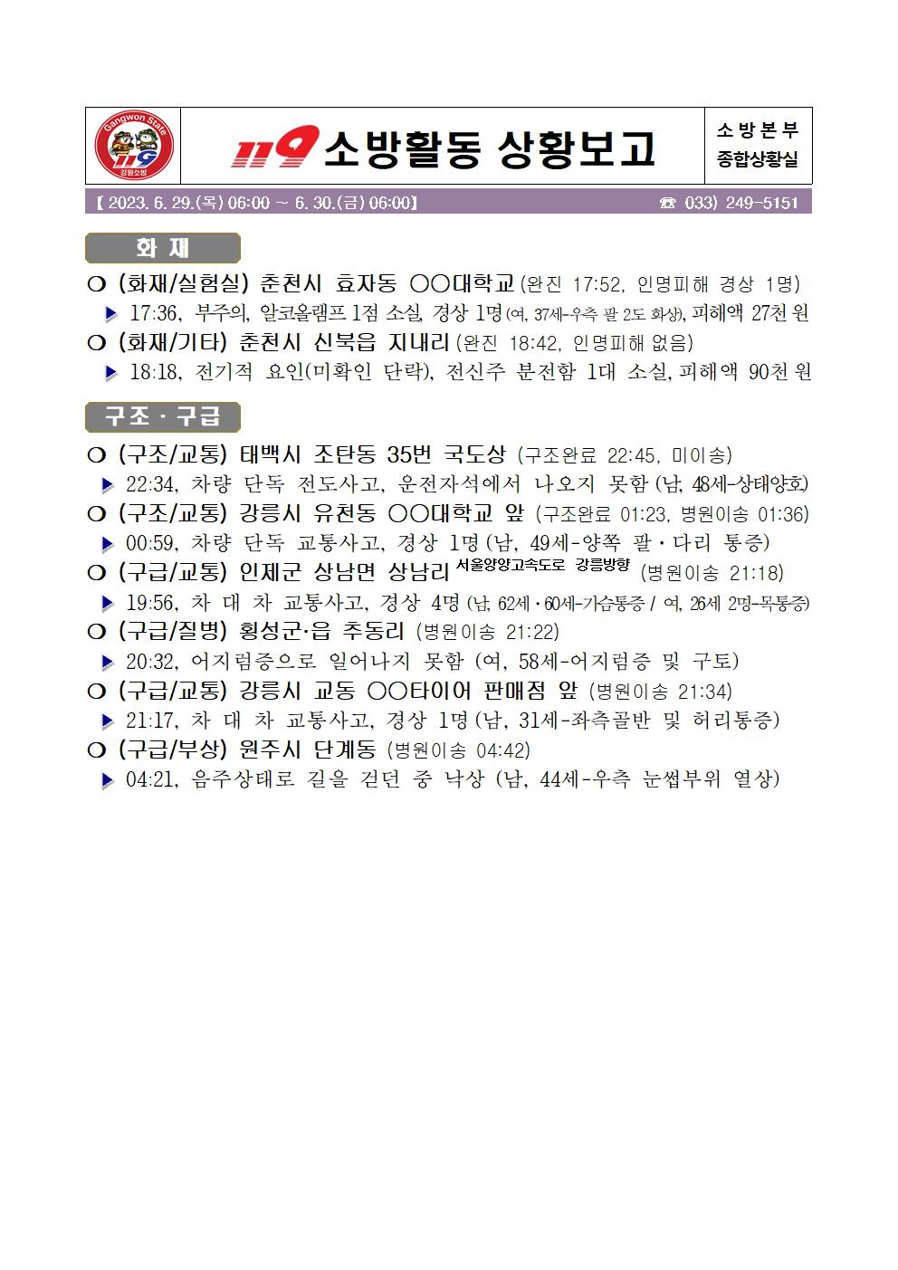 119 소방활동 일일상황보고(6.30.금) 06:00