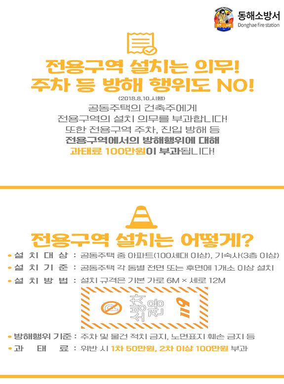 동해소방서(서장 김정희)는 11월 불조심 강조의 달을 맞아 소방차의 신속한 출동과 국민의 소중한 생명과 재산을 지키기 위해 공동주택 내 소방차 전용 주차구역 확보에 적극적으로 동참해줄 것을 당부했다.