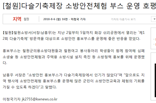 | 23181 | (철원) 다슬기축제장 소방안전체험 부스 운영 호평 | 철원홍보 | 2018-08-07 | 200 | |