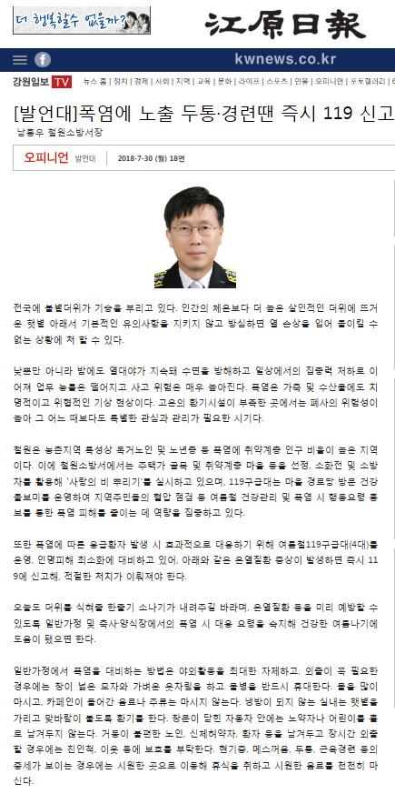 | 23139 | (철원) '기고' 폭염에 노출 두통.경련땐 즉시 119신고 | 철원홍보 | 2018-07-30 | 227 | |