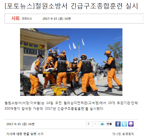 | 21723 | (철원) 철원소방서 긴급구조종합훈련 실시 | 철원홍보 | 2017-09-18 | 209 | |