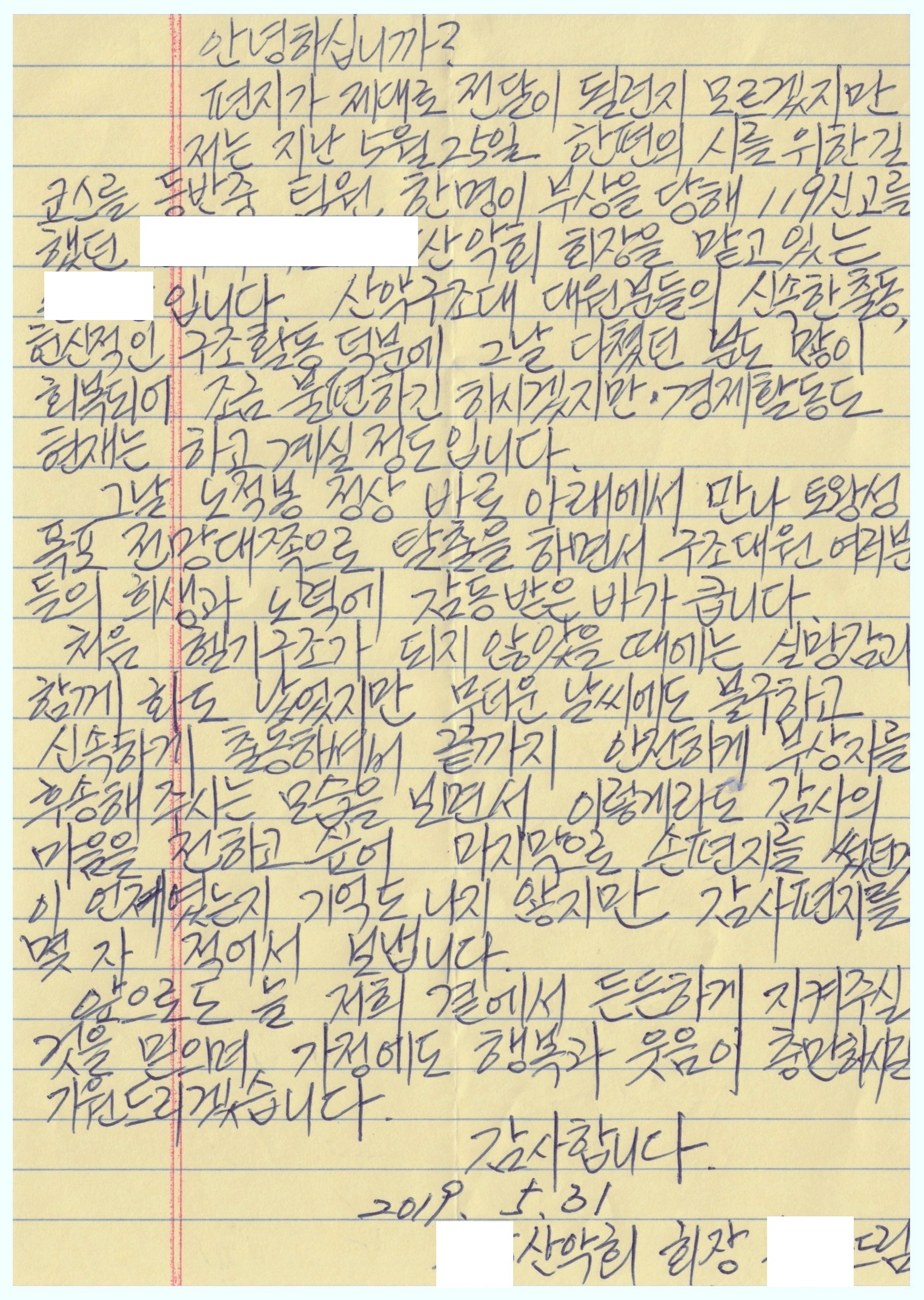 산악구조 수혜자의 감사편지