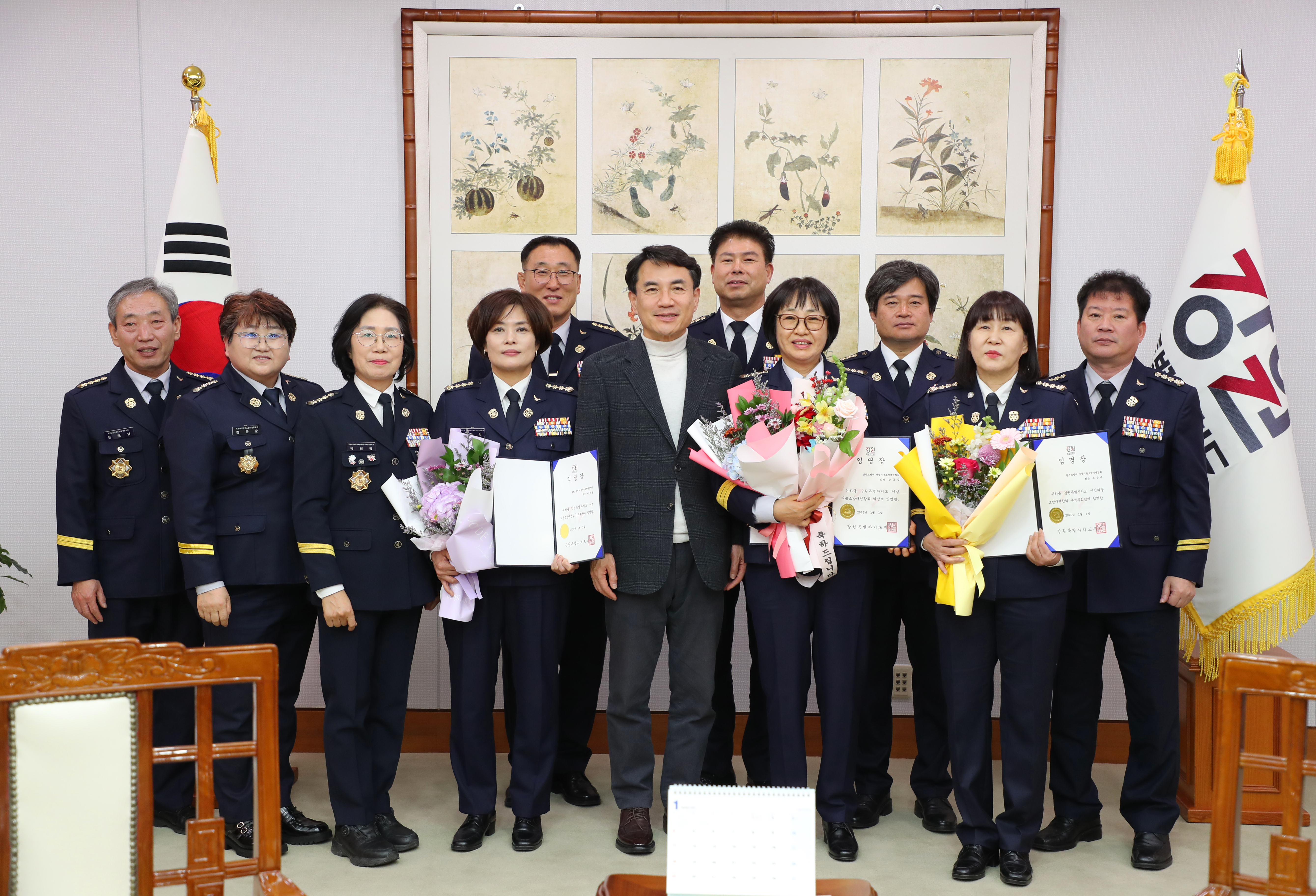 ○ 강원특별자치도 소방본부(본부장 오승훈)는 9일 도청 통상상담실에서 김진태 도지사가 참석한 가운데 신임 여성의용소방대연합회 임원 임명장 수여식을 개최했다.