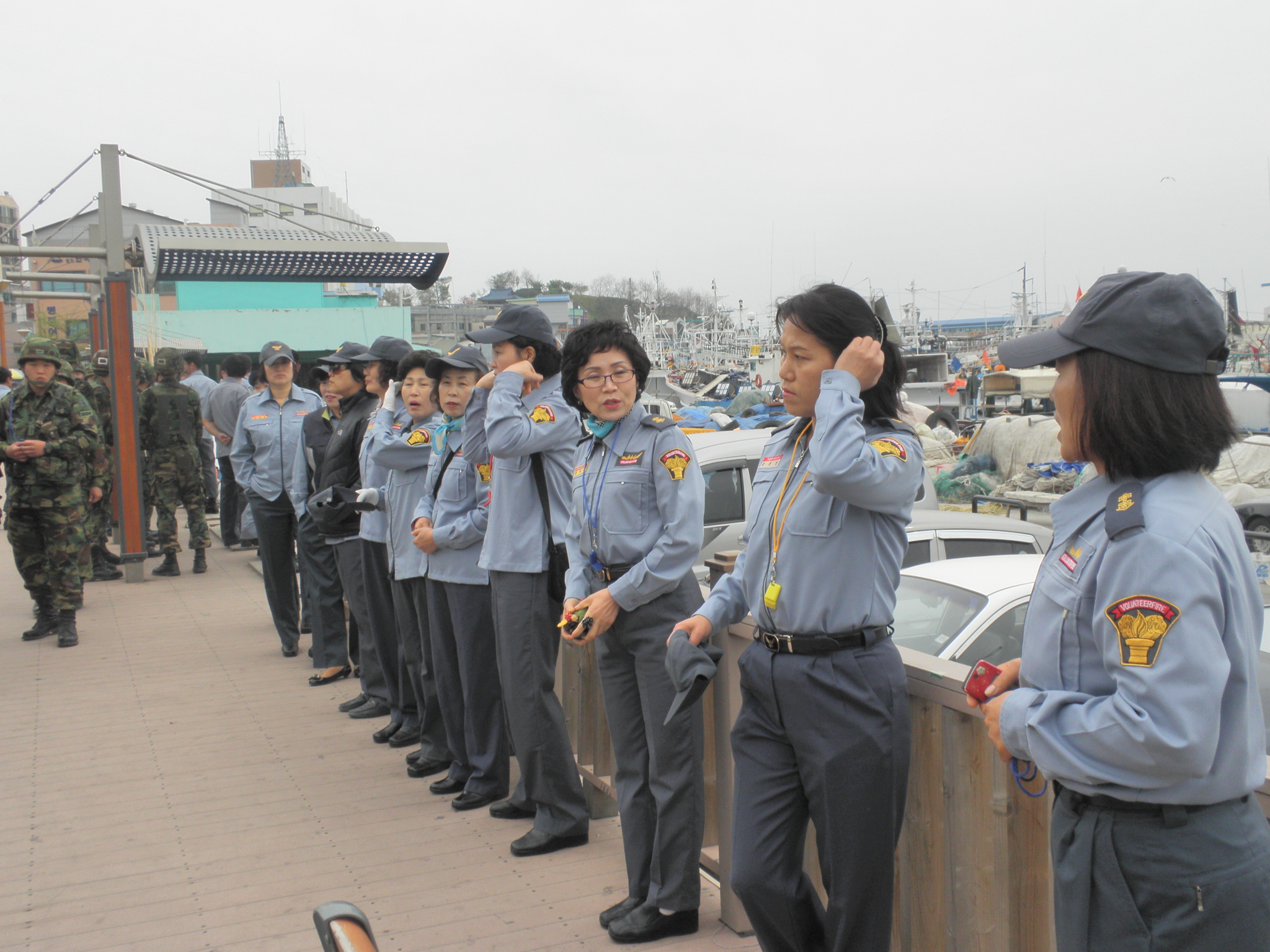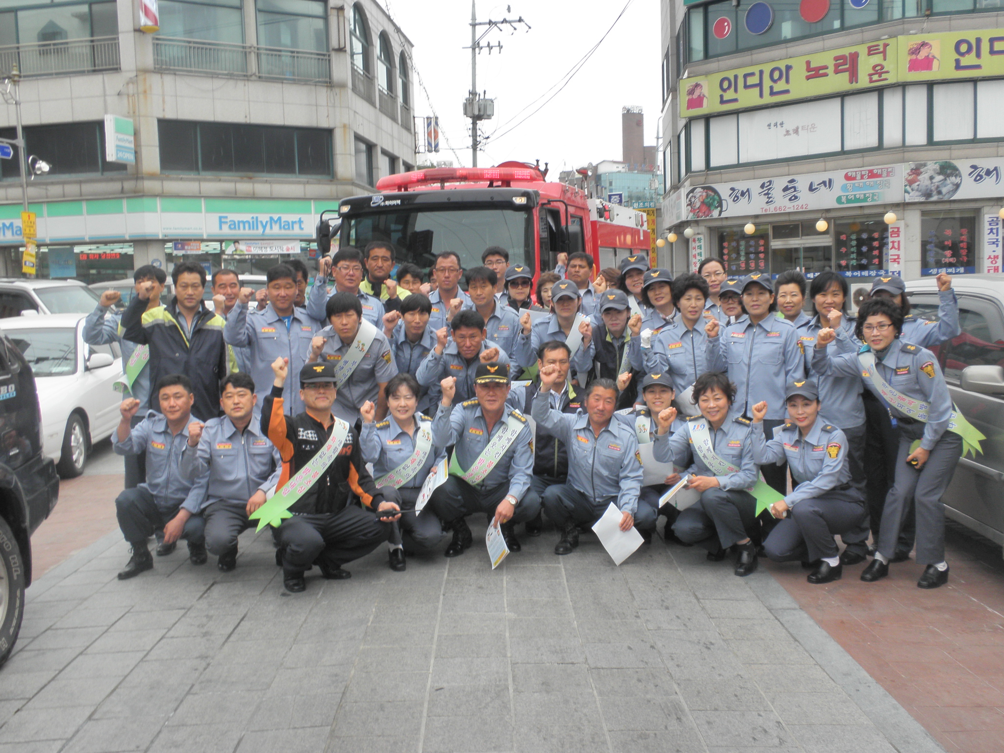 신 애순 대장님 ,김 남길 회장님 , 재난 훈련및 주문진시장 소방 통로 확보 전단지 홍보