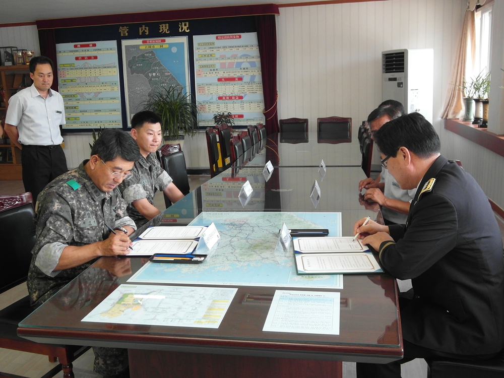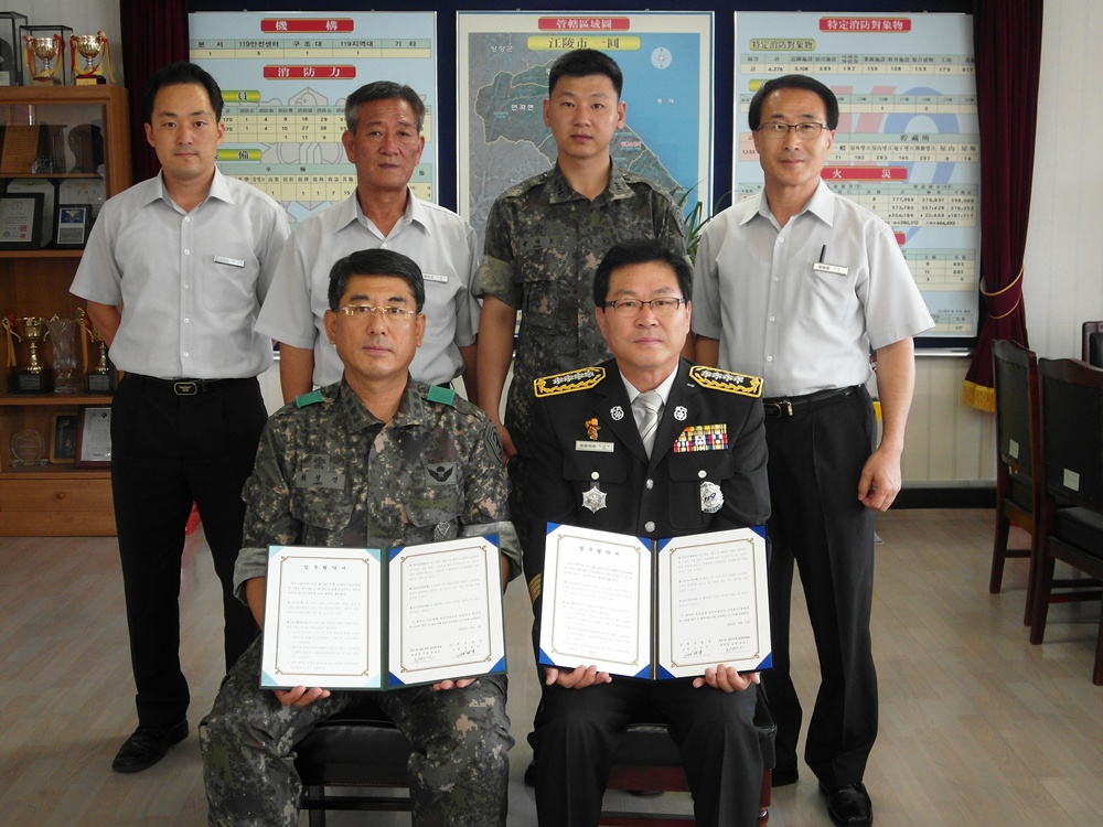 강릉소방서 (서장 김남숙)는 2012. 8. 1(수) 14:00 의료지원 및 구호활동과 관련 제32예비군관리대대와 상호업무협정을 체결하였습니다.