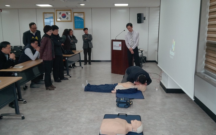 이날 교육은 심정지 환자 발생시 목격자에 의한 현장에서의 적극적인 심폐소생술과 자동제세동기를 이용한 전기충격요법 등 환자의 소생율을 높이기 위한 실습 위주의 교육으로 직원들의 큰 호응을 얻었습니다.