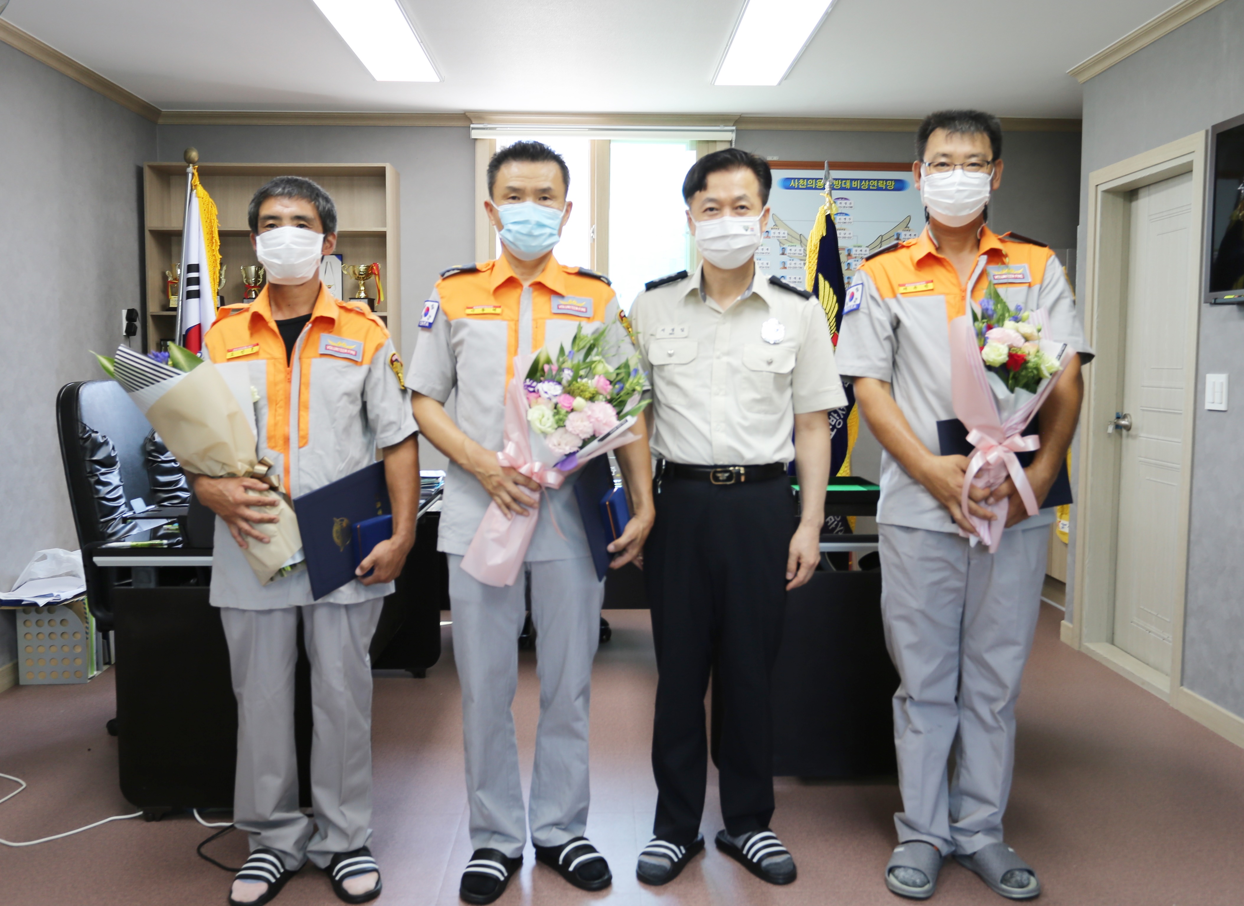 유공자는 체규만 보급반장, 이종택 대응반장, 고인호 대원이며, 18일 오후 15시 45분경 사천면 성연로 일대에서 발생한 농막 화재를 목격하고 소화기로 진압하는 등 화재 진압활동에 큰 도움을 주었을 뿐 아니라 재산상의 피해를 최소화 하는데 솔선수범하여 화재진압활동에 임한 공로가 인정되었다.