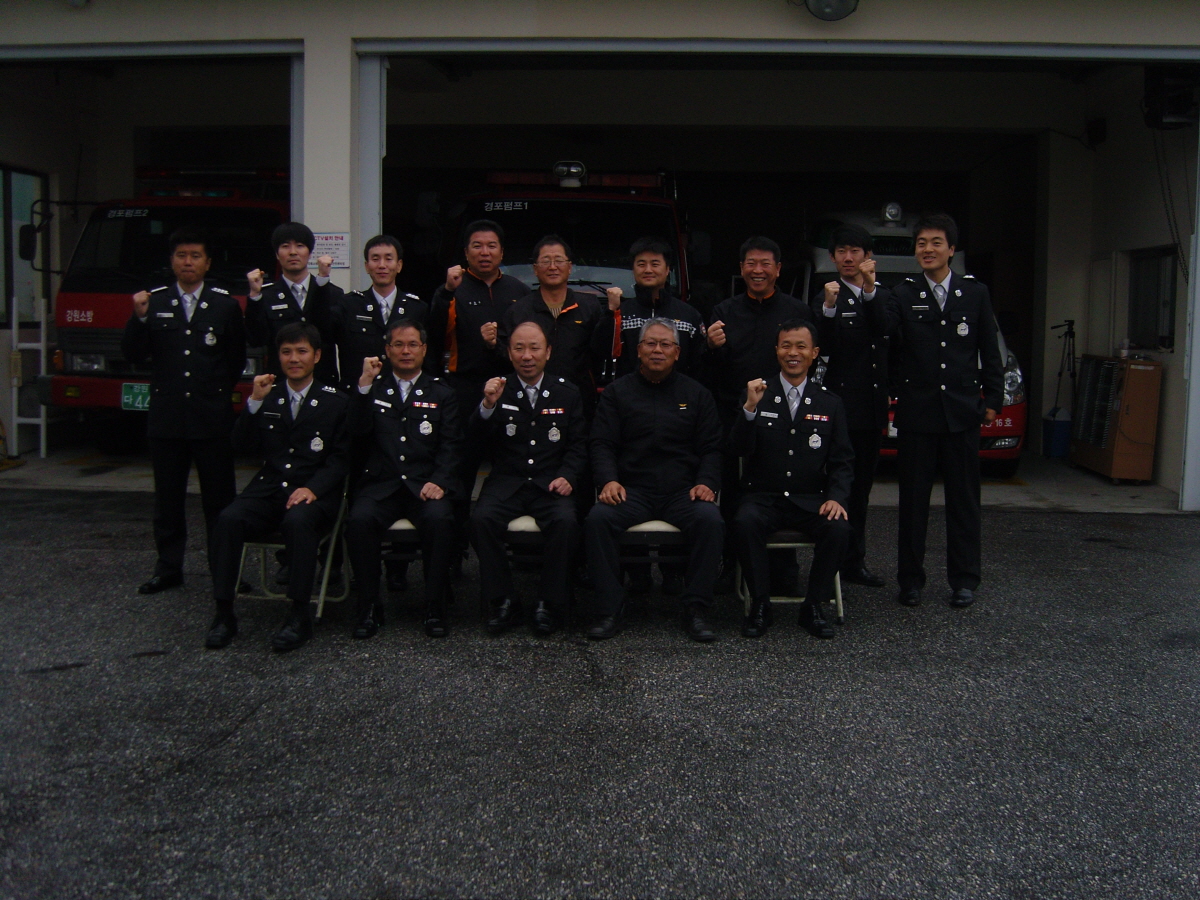 49주년 소방의 날 행사를 마치고 경포센터 청사앞에서 경포센터장 김택정외 15인이 함께 기념촬영을 가졌다.