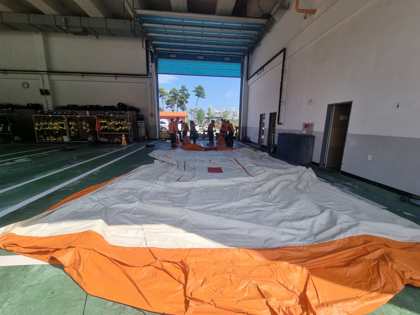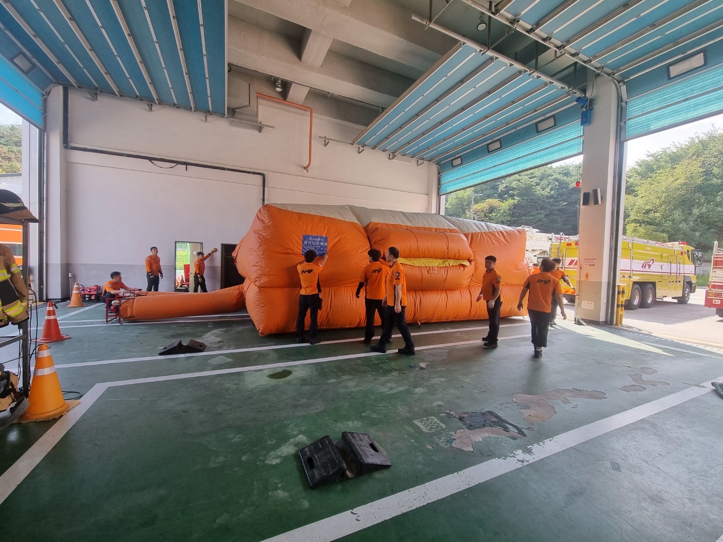 이날 소방서는 공기안전매트 내 외부 점검 및 신속한 전개 훈련, 사용시 주의사항등에 대해 교육을 하였으며