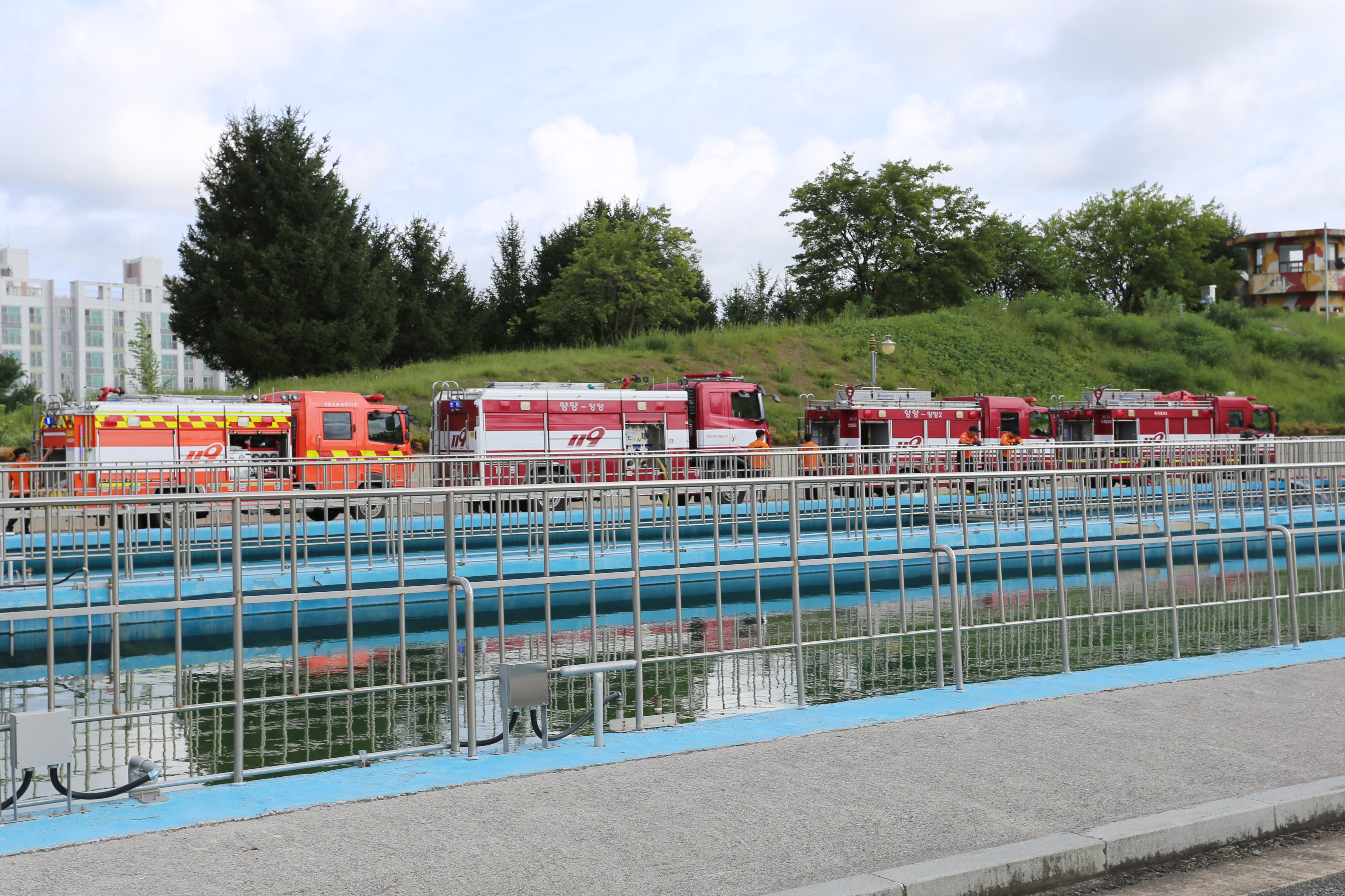 오늘 오전 8시 30분부터 소방차량 22대(영동지역 12대, 강릉 10대)를 동원하여 연곡정수장에서 충수 후 홍제정수장으로 이동 급수하였으며 하루 예상 공급 수량은 약 465톤입니다.