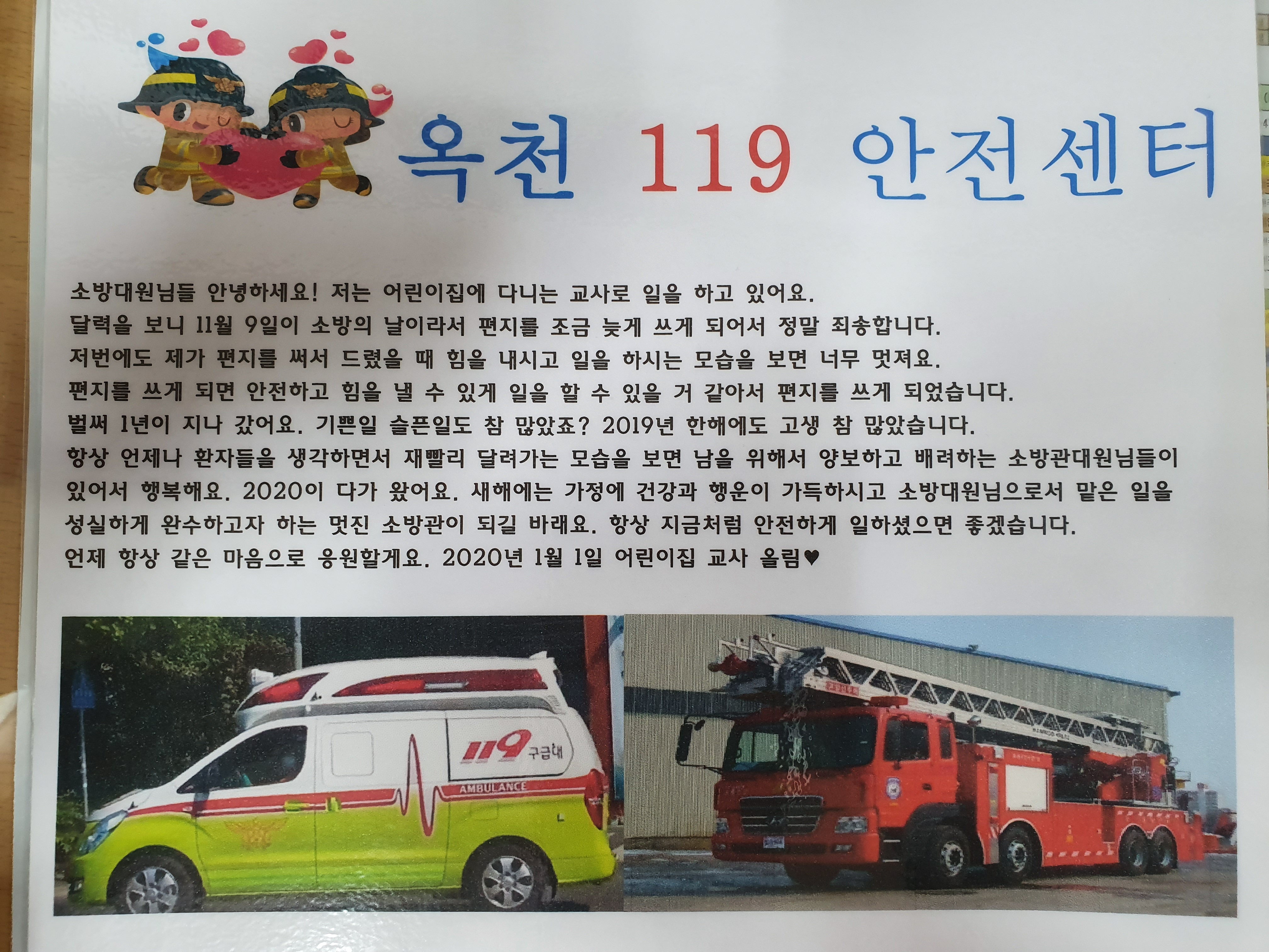 2020년 경자년을 맞이하여 옥천119안전센터로 무명의 감사의 편지가 전달되었습니다.