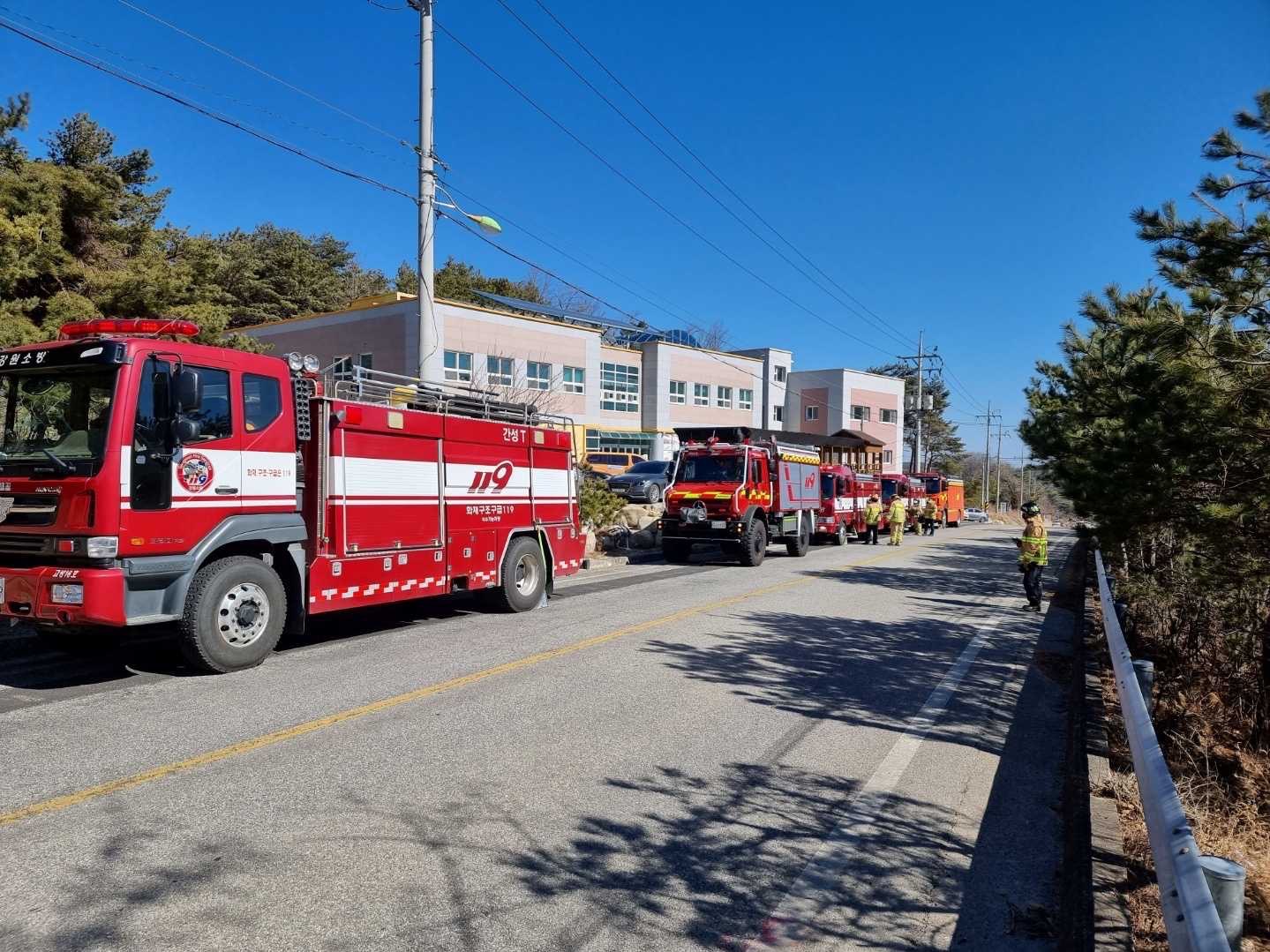 강원소방본부 주관으로 마련된 ‘동해안 산림화재 가상 실제 동원훈련’은 광역대응 훈련으로 도내 전 소방관서가 참여했으며 96대의 차량(펌프 39, 물탱크 18, 기타 40)이 동원됐다.