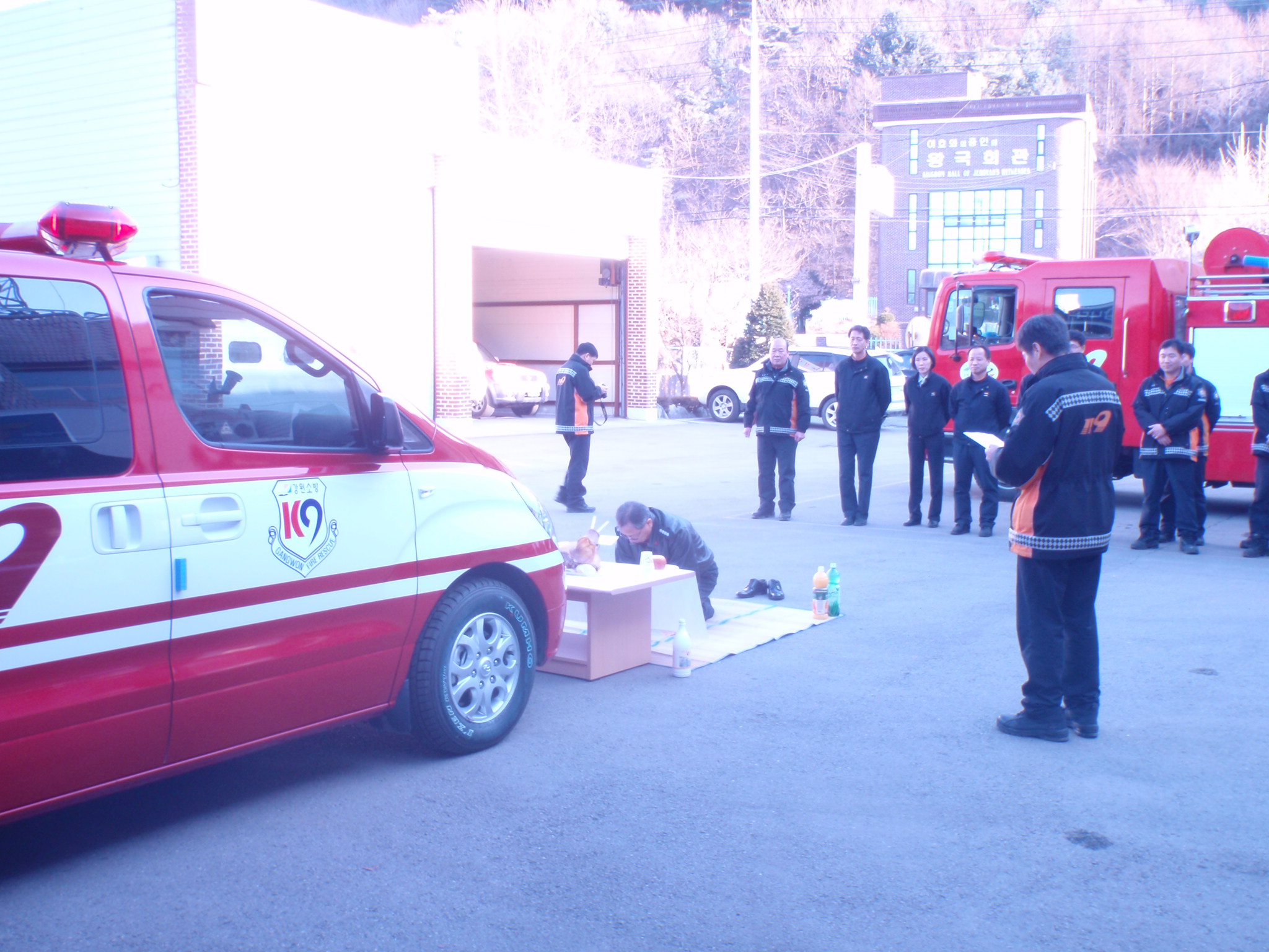 2011. 2. 22(월) 16:00 홍천소방서 청사앞에서 서장님(김진봉)포함 전직원 일동은 새로운 식구를 맞이한 지휘차가 홍천소방서의 큰 일꾼이 되기 위해 단 한건의 사고도 없도록 안전운행 기원제를 실시하였습니다.