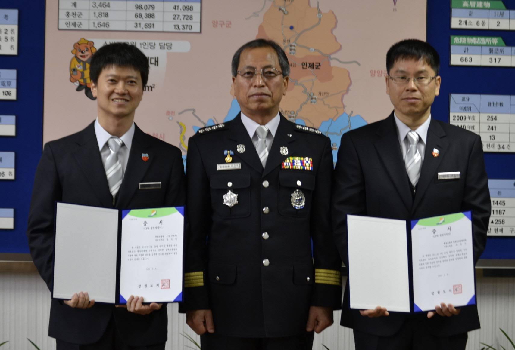 홍천소방서(서장 김진봉)는 15일 오전10시 본서 대회의실에서 심정지환자를 응급처치하여 소생시킨 소방장 김동신외1명에 대한 『CPR- 생명지킴이』영예수여식을 개최했다.