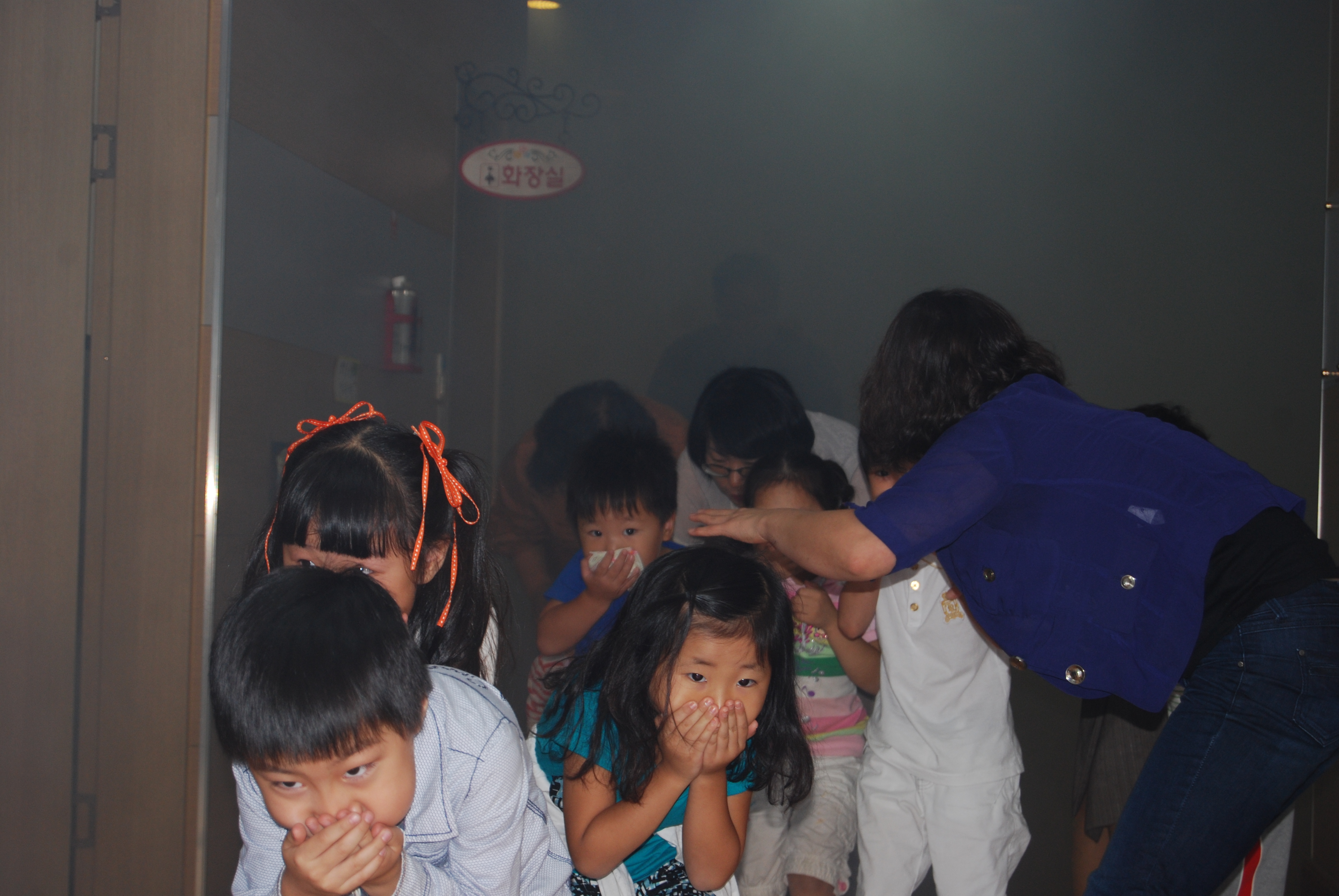화재발생시 다수인원의 대피로 인한 안전사고 부담도 있어 위험상황에 동요 되지않고 효율적으로 안전하게 대피하는 능력을 배양하고자 실제상황처럼 연기를 발생시킨후 비상벨을 울려 1층 옥외 놀이터와 옥상으로 나뉘어 대피하는 훈련을 실시했다.