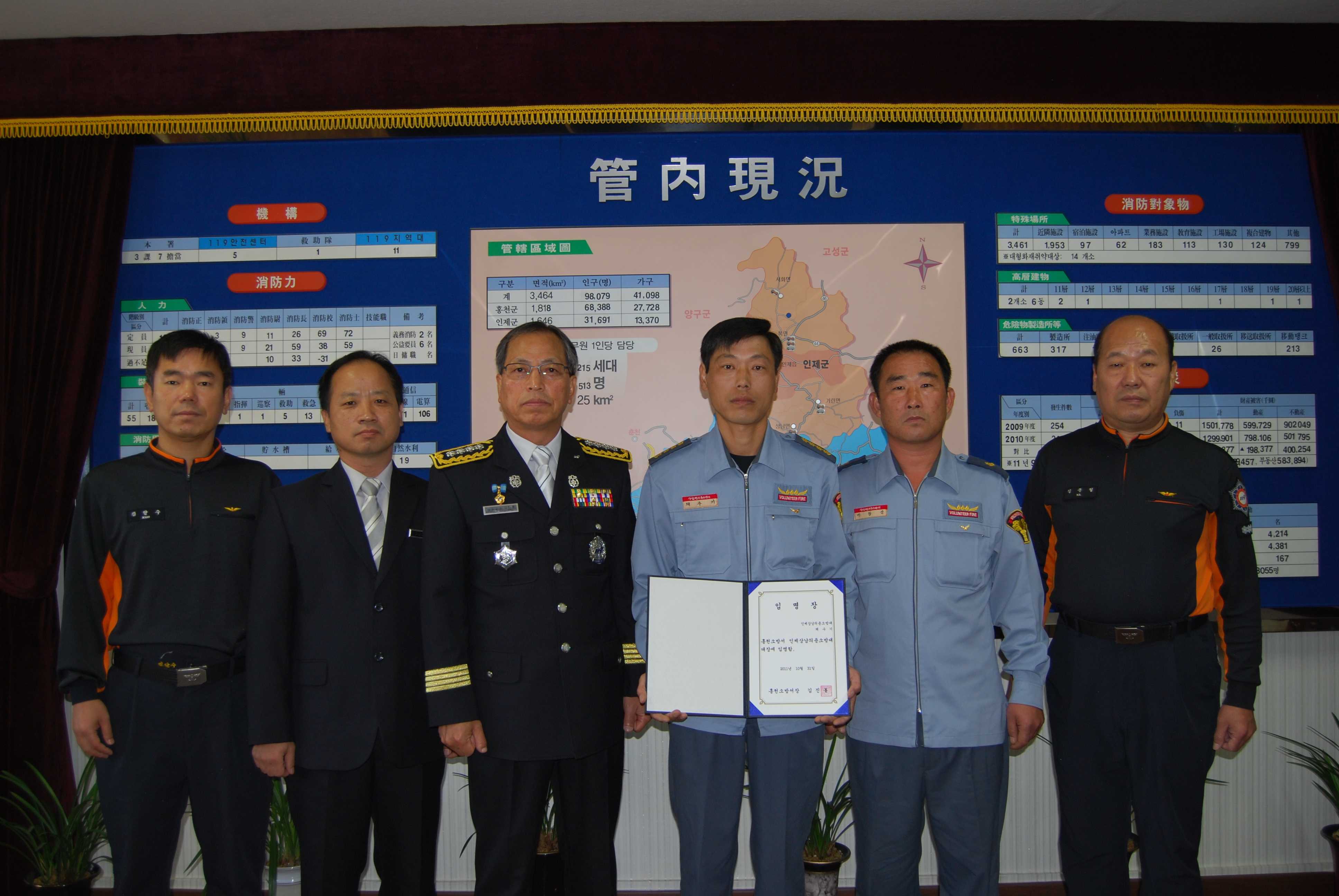 홍천소방서(서장:김진봉)에서는 10월 31일(월) 신임 인제상남의용소방대 대장 임명장 수여식을 가졌다. 신임 채수기 대장은 서무반장, 총무부장을 역임하였으며 평소 화재 및 각종 구조구급현장에 신속히 출동하여 재산 및 인명피해를 줄이기 위해 헌신적으로 노력하였으며, 다양한 봉사 및 선행 활동에 참여하여 지역주민들의 칭송이 자자한 인물로 알려져 있다.