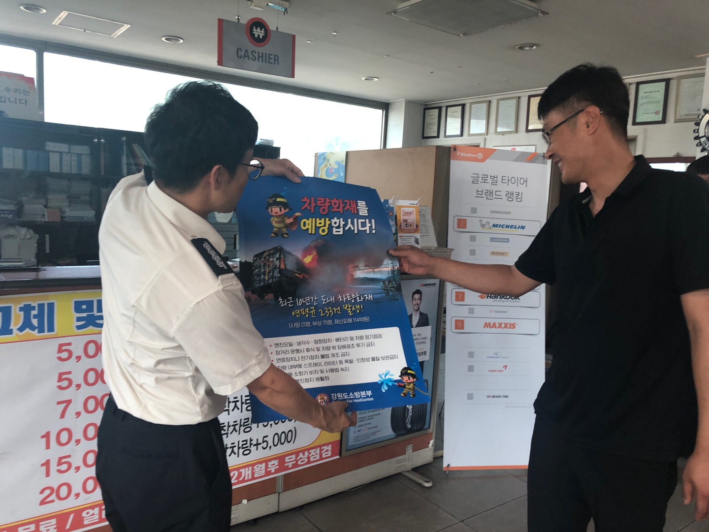 차량화재 예방 포스터 배부 및 차량용 소화기 비치 홍보