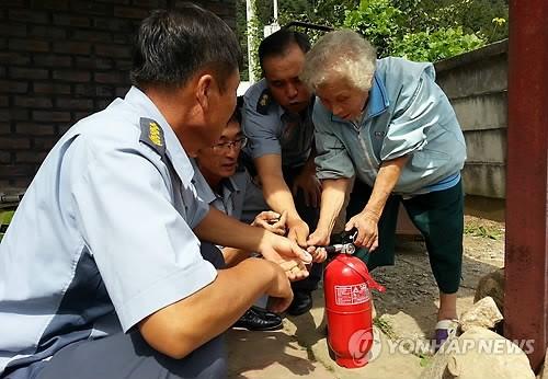 (홍천=연합뉴스) 5일 홍천소방서 대원들이 홍천군 두촌면의 화재 취약 가구를 방문해 소화기 등 기초 소방시설을 점검하고 있다. 대원들은 이날 예초기 안전사고 예방 안내와 집안 일손돕기 등의 봉사활동도 펼쳤다.