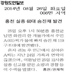 홍천, 실종 60대 숨진채 발견(도민)