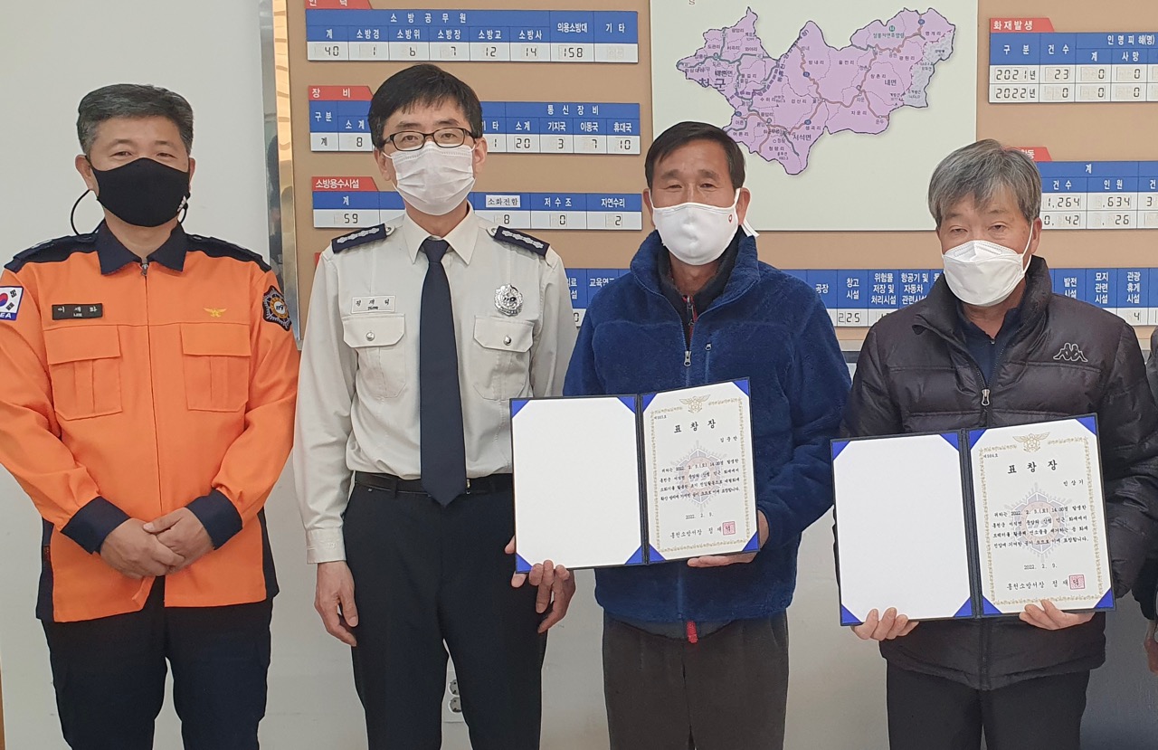 □ 유공자 김준만씨와 민상기씨는 지난 2. 5.(토) 오후 1시경 서석면 풍암리에서 발생한 화재 현장에서 소방서 출동대가 도착하기 전 소화기를 이용하여 초기 화재진압을 시도하며 개인 트랙터를 이용하여 가연물을 제거하는 등 대형 산불로 번질 수 있었던 상황을 예방한 공로를 인정 받았다.