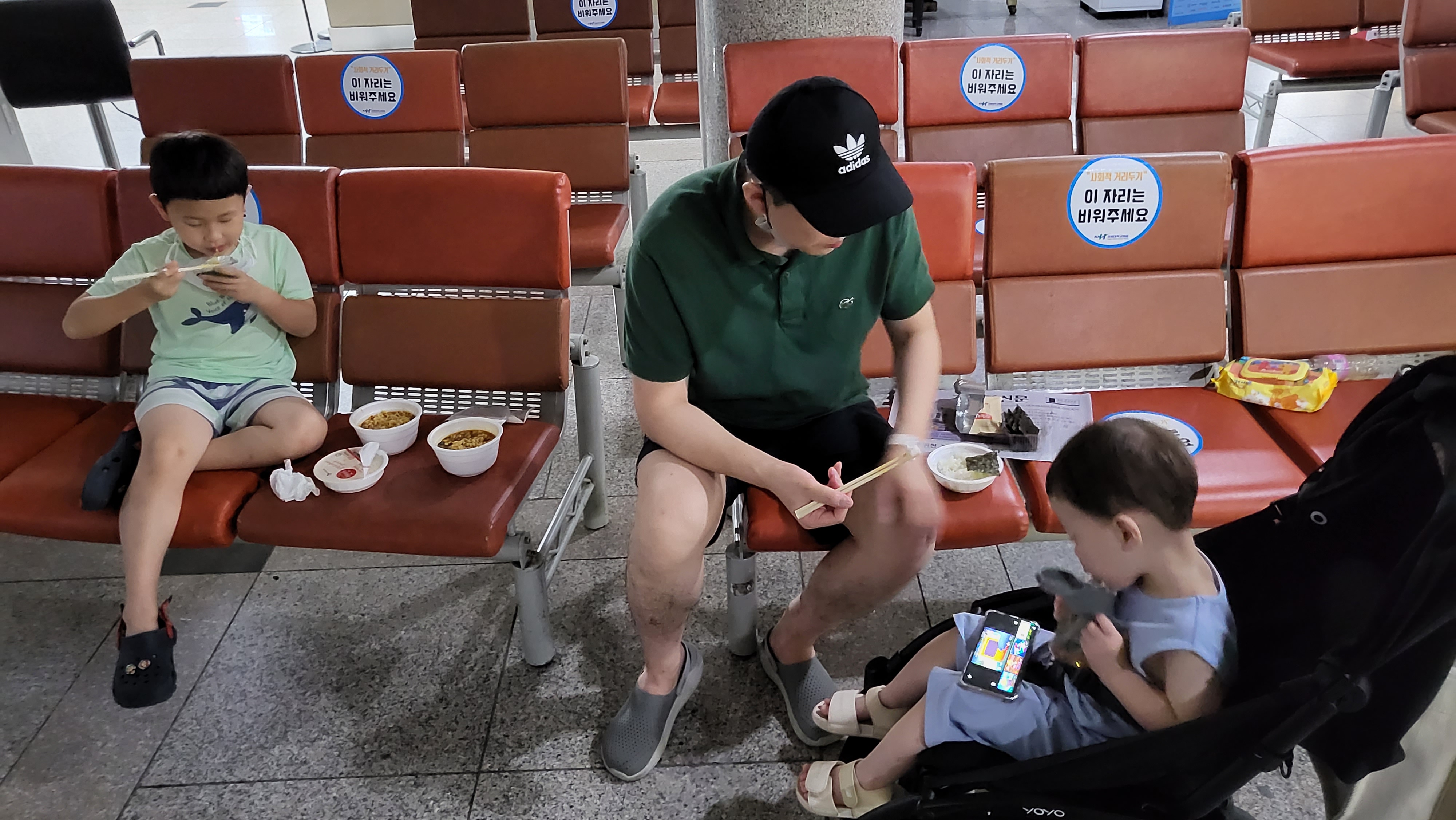 첨부사진은 응급실에서 컵라면으로 끼니때우는 제아들과 손주들입니다.