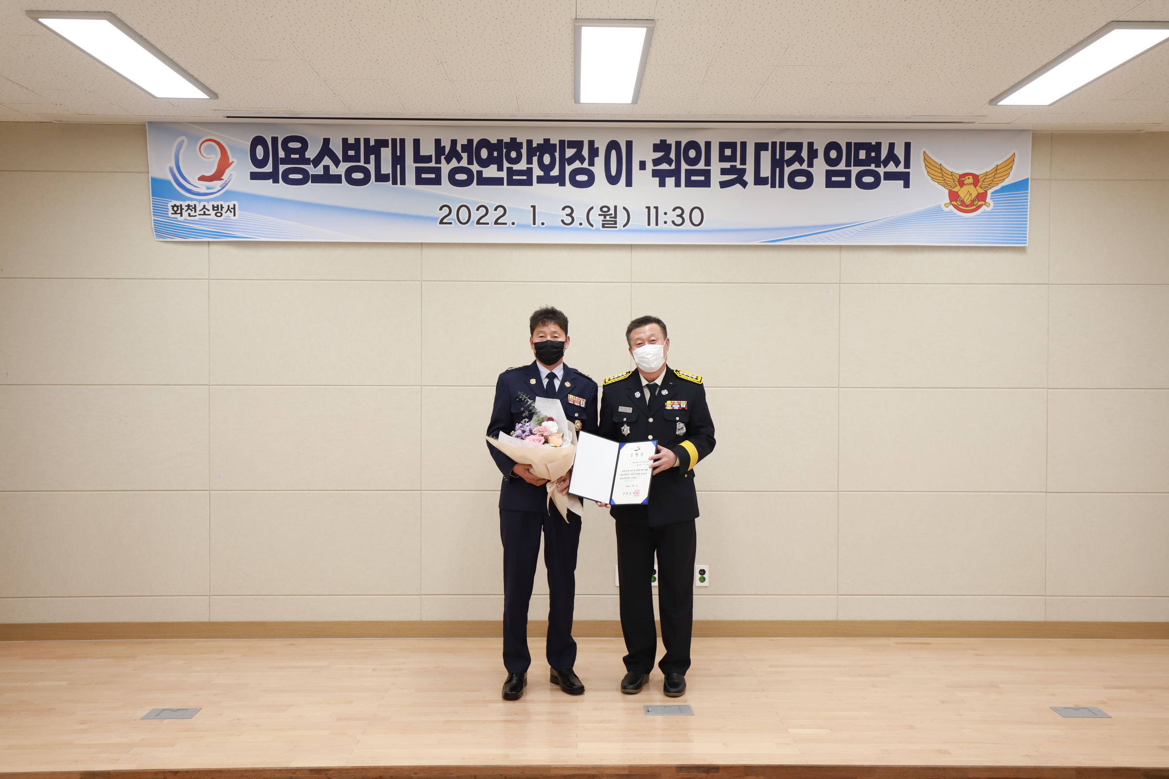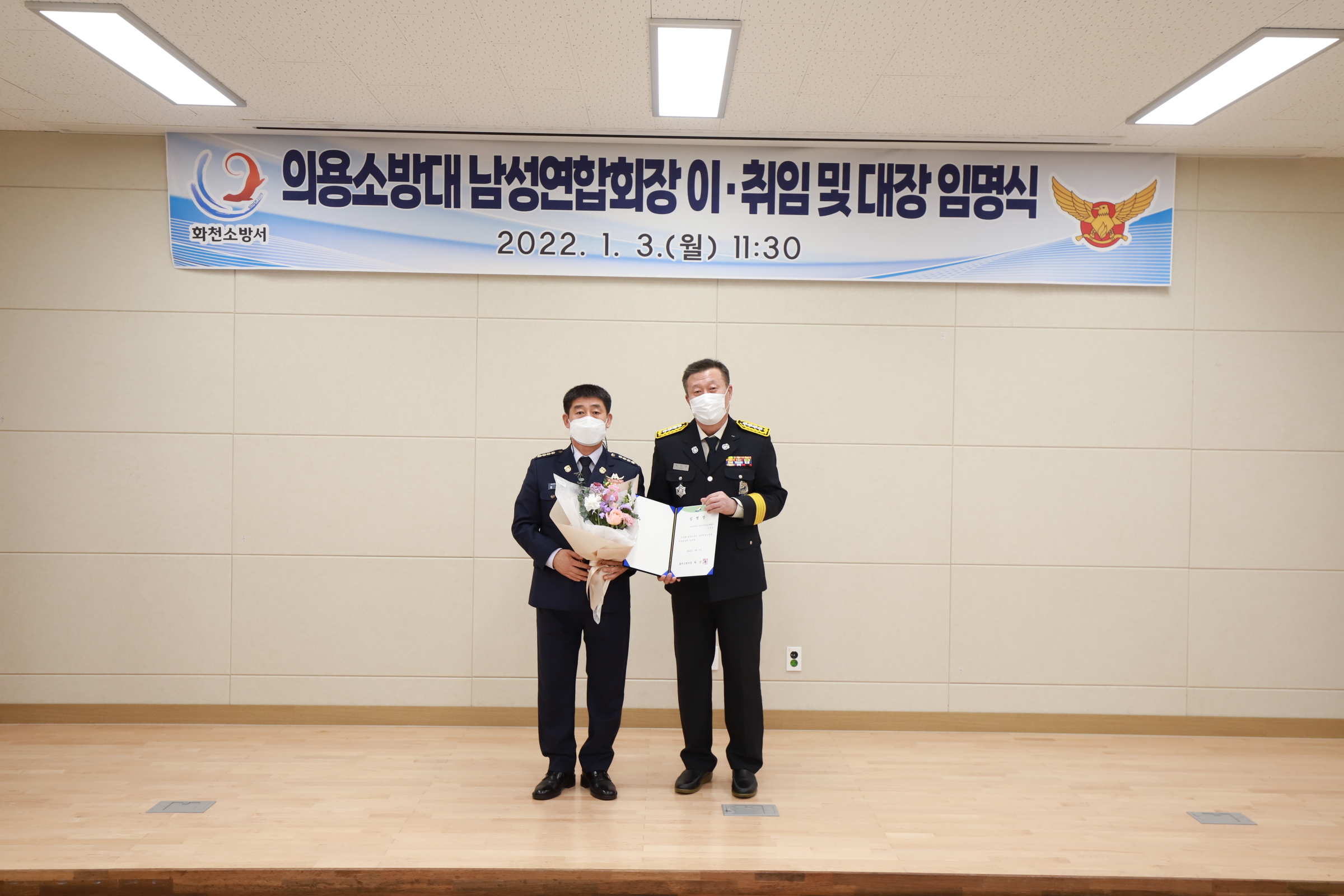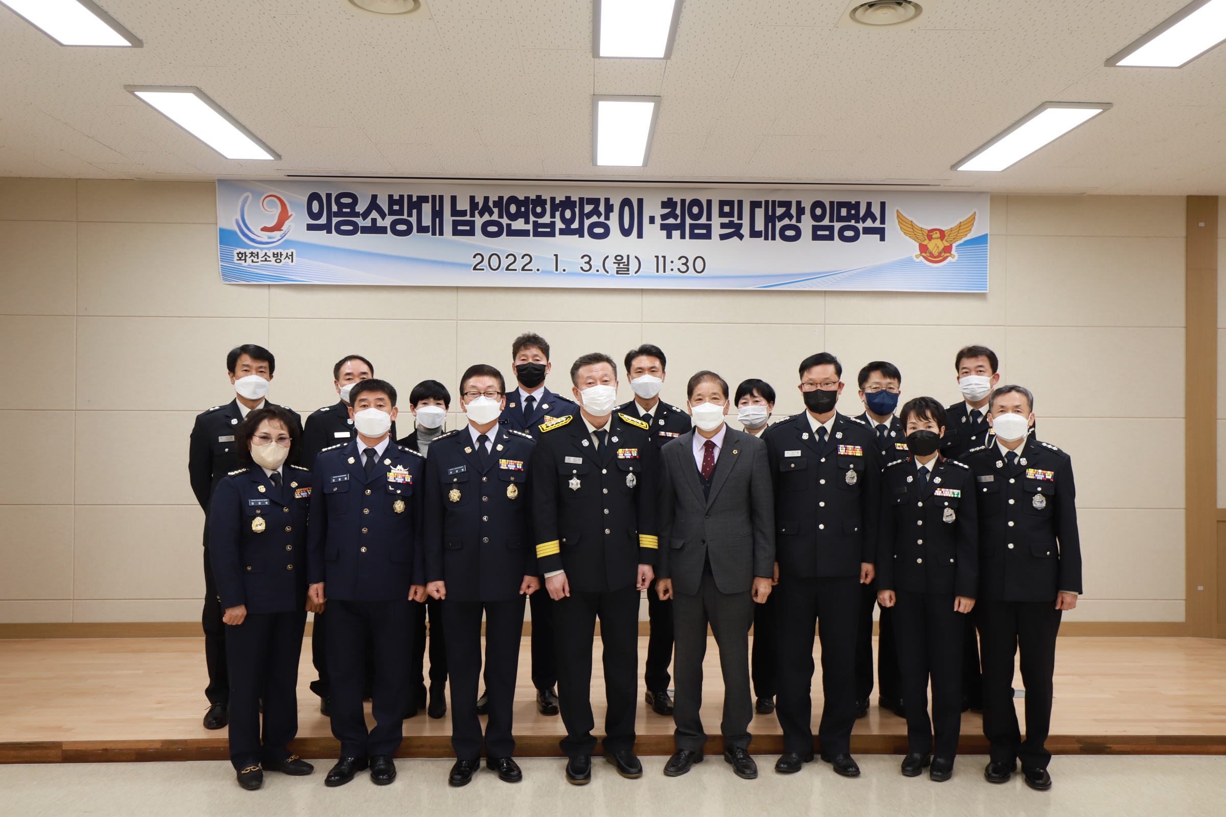 화천소방서장은 2022. 1. 3.(월) 남성의용소방대연합회장 이취임 및 대장 임명장 수여식을 개최하였다