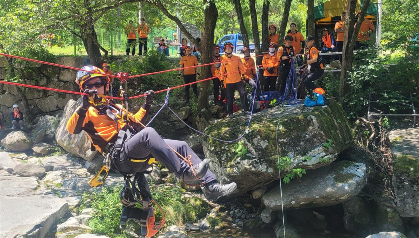 소방공무원 27명과 의용소방대원 20명이 참석한 이날 훈련에서는 로프총 및 빅샷 사용법 숙달을 비롯해 계곡구조 장비, 급류구조 장비 활용, 로프설치를 통한 급류 횡단 방법 등에 대해 교육하였습니다.