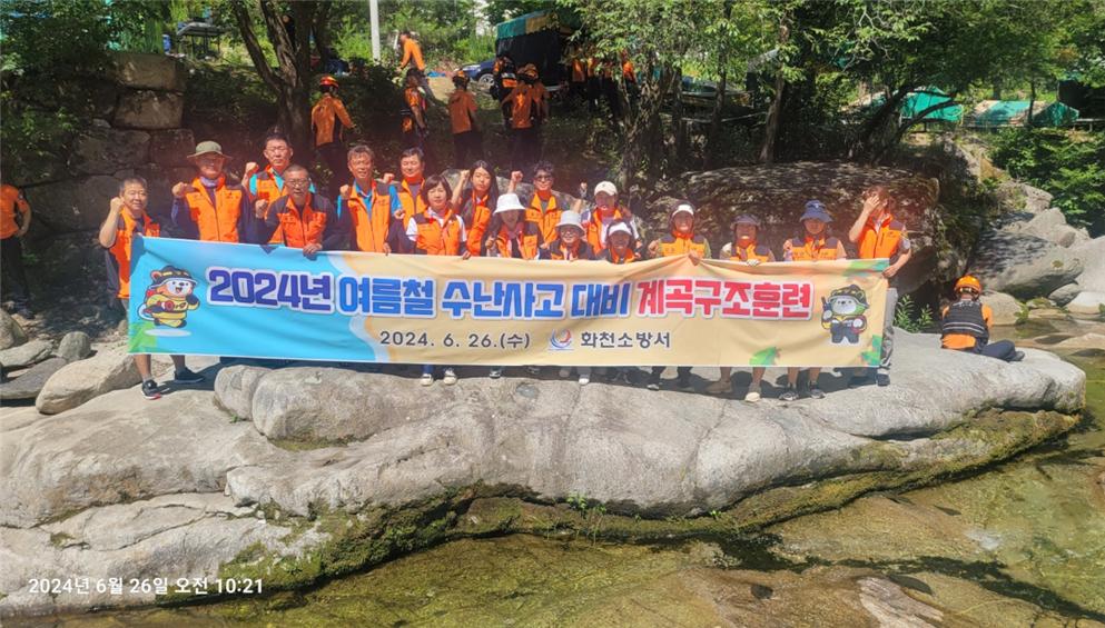 화천소방서는 26일 사내면 삼일리 화음동정사지 일원 계곡에서 폭우로 인한 야영객 고립사고 발생에 대비, 인명구조 훈련