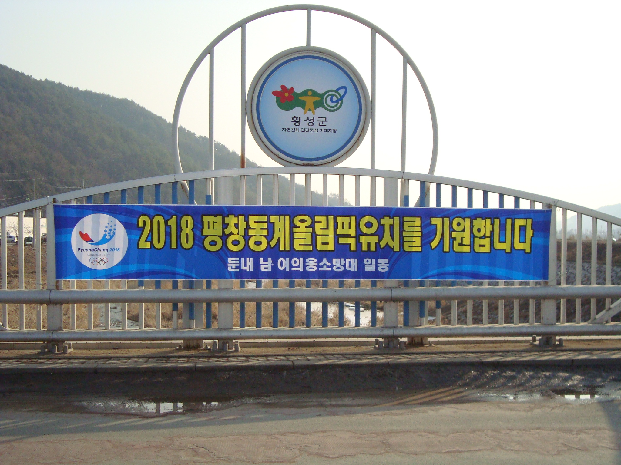 동계올림픽유치기원을 위해 둔내시가지 일원에 현수막을 걸었습니다.
