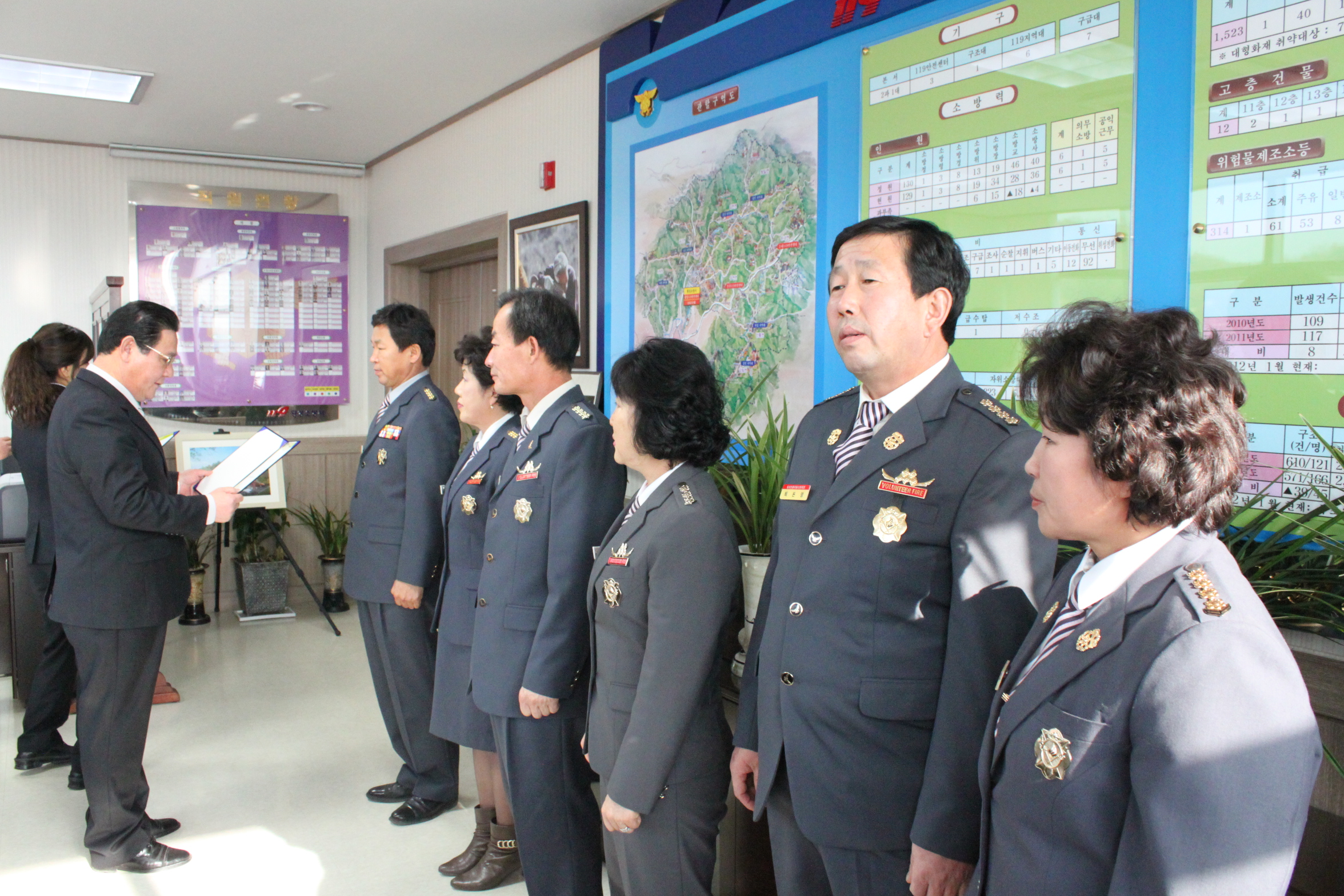 횡성소방서(서장 조근희) 는 1월 12일(목) 오후2시 서장실에서 횡성군의용소방대연합회 임원 위촉식을 가졌다. 연합회 임원으로는 남성연합회장(둔내의소대장 최순석), 여성연합회장(강림여성대장 장주옥), 남성부회장(우천의소대장 이과연), 여성부회장(횡성여성대장 박선숙), 남성감사(안흥의소대장 최돈영), 여성감사(공근여성대장 이재완), 총무(강림대장 장상욱, 서원여성대장 윤은숙)로 구성되었습니다.