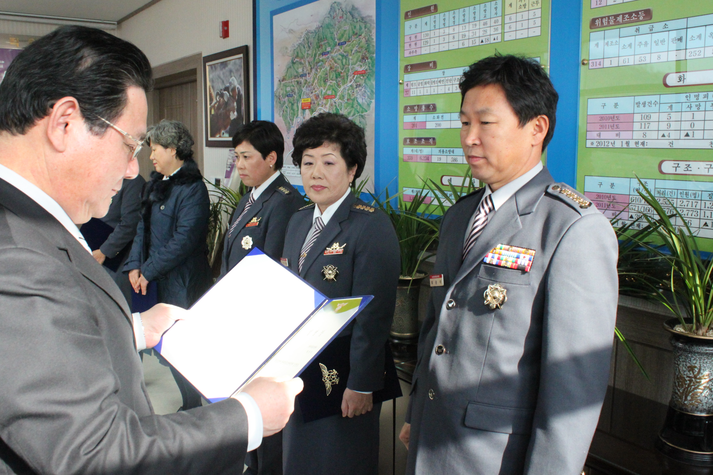 횡성소방서(서장 조근희) 는 12일(목) 오후2시 서장실에서 연임대장에 대한 임명장을 수여하였다. 연임대장으로는 둔내대장(최순석), 서원여성대장(윤은숙), 갑천여성대장(김향자), 청일여성대장(이명순), 강림여성대장(장주옥)이 임명되어 앞으로 3년 동안 의용소방대를 위해 최선을 다할 것을 다짐했다.