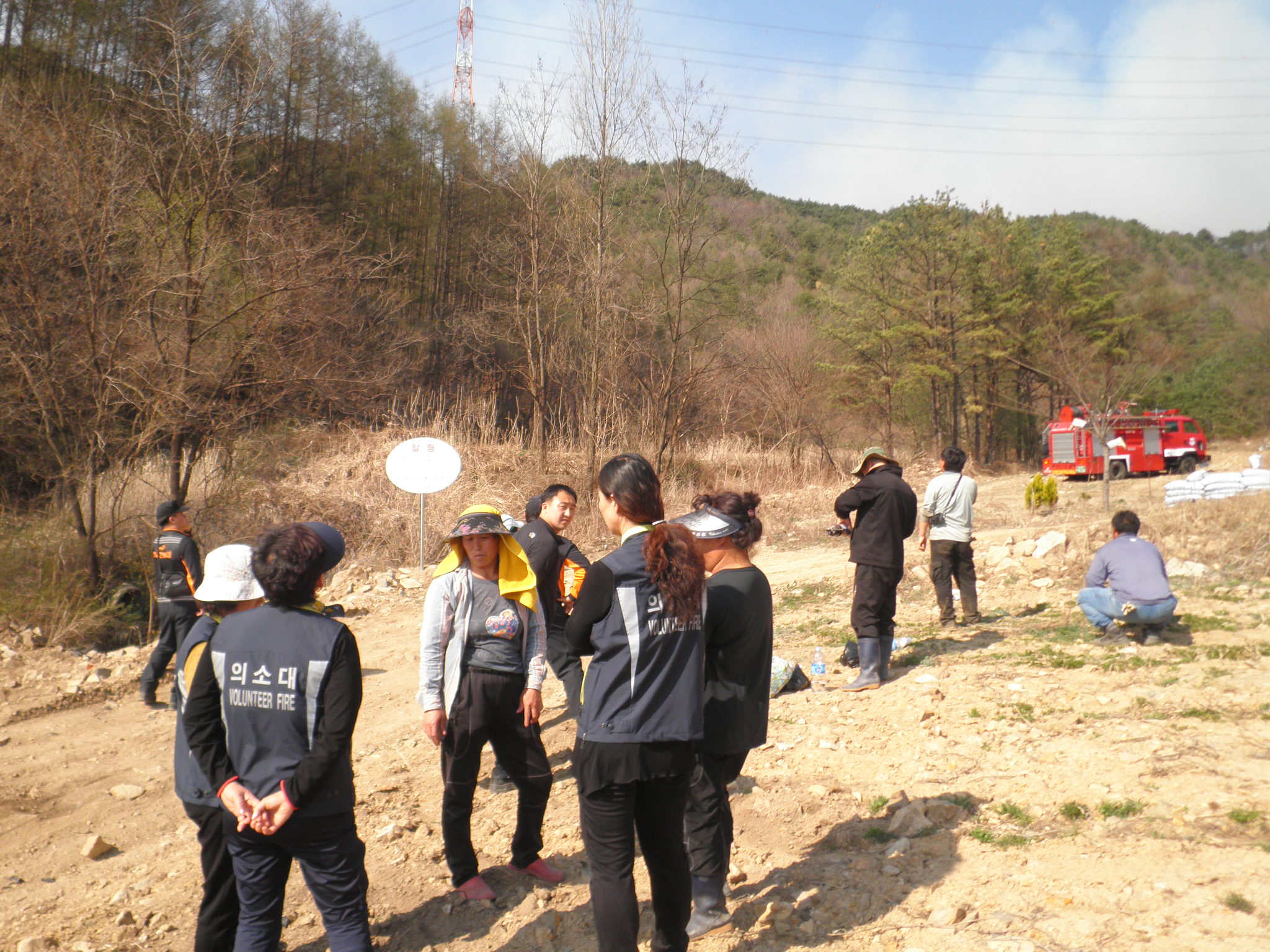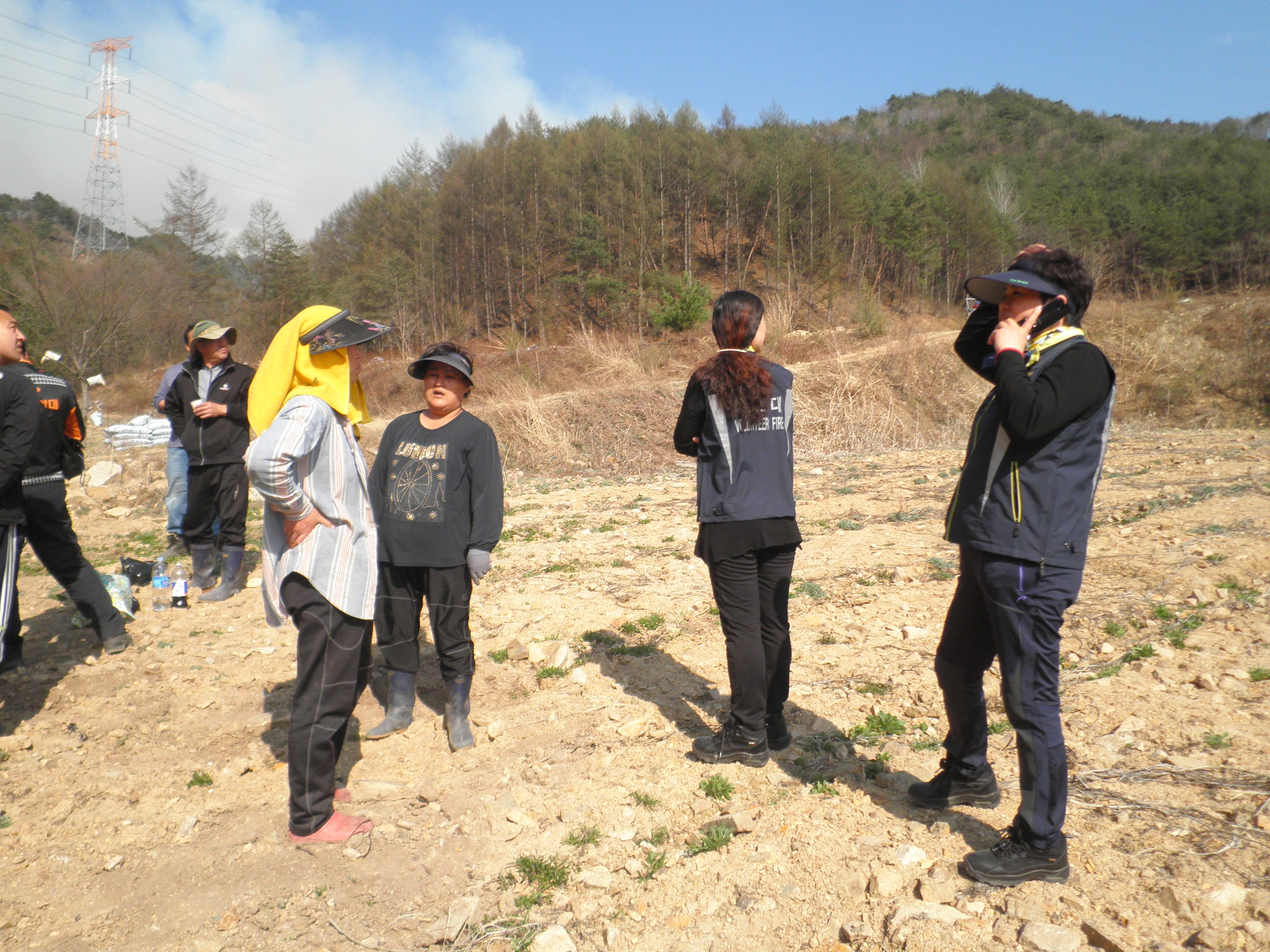 4월 20일 12시 53분 청일 여성의용소방대 고시리 산불진화작업 봉사활동 대장(이명순)외 대원들이 커피 및 음료봉사