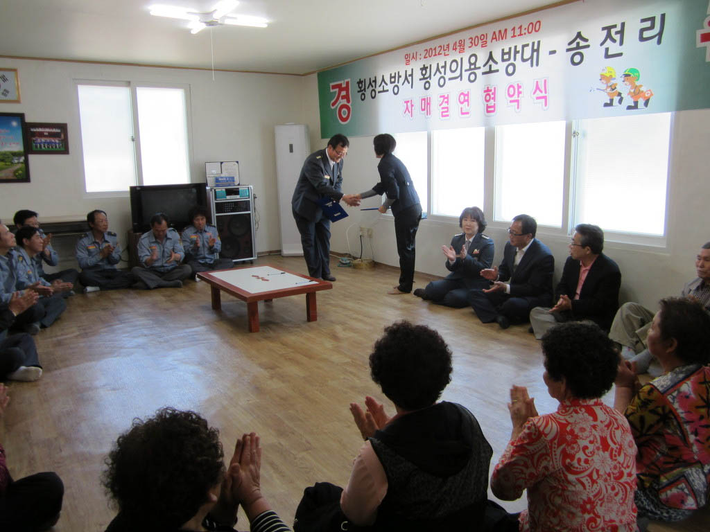 횡성의소대에서 4월 30일 오전 10시 30분부터 횡성읍 송전리 마을회와 자매결연협약을 송전리 마을회관에서 김승기 횡성읍장님을 모시고 횡성의소대 간부님들과 송전리마을 리장님을 비롯하여 어르신들을 모시고 협약식을 체결하였습니다.