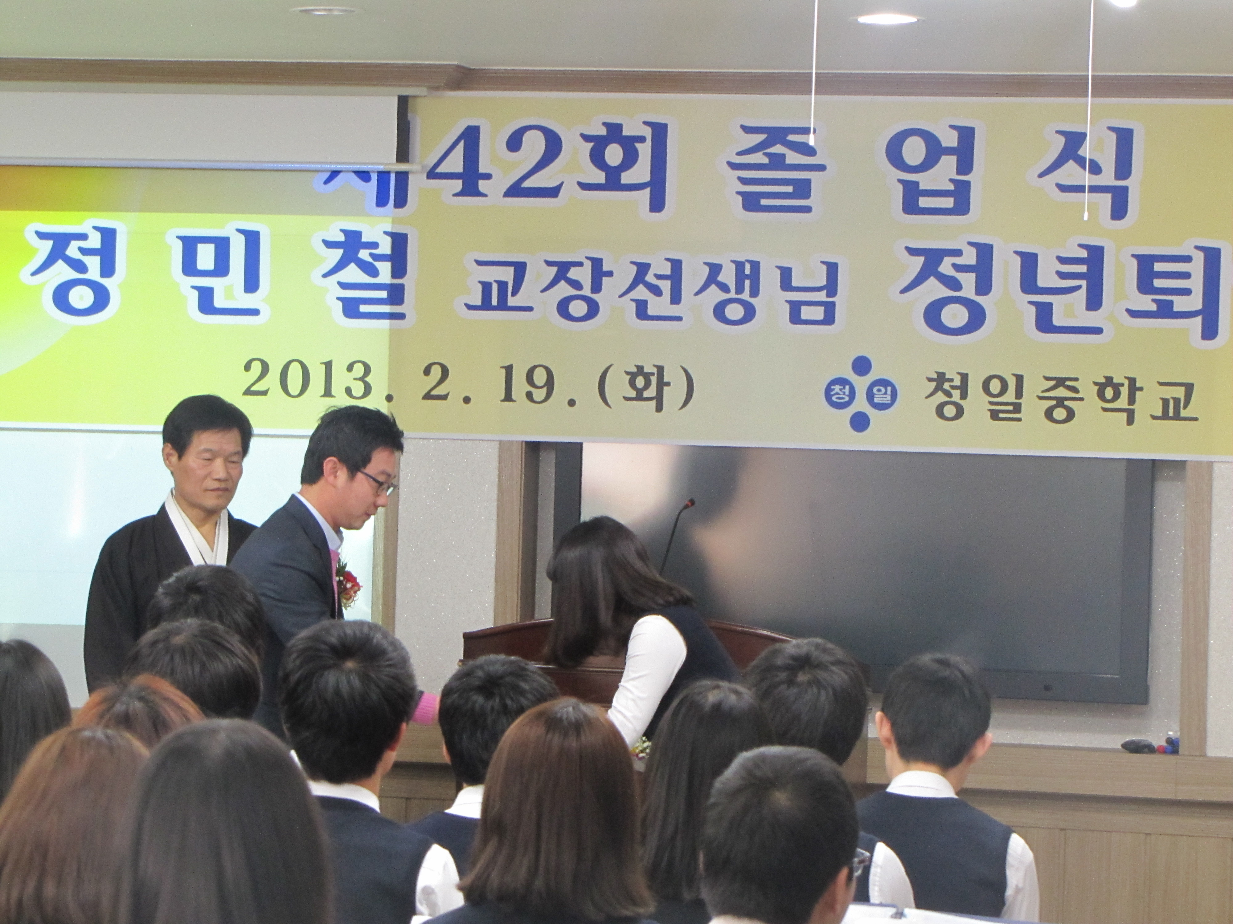 청일(남,여)의소대(대장 : 이재훈, 이명순)는 2.19(수) 청일중학교에서 열린 졸업식에 참석하여 이날 졸업하는 청일중학교 학생들에게 장학금을 전달하였다.