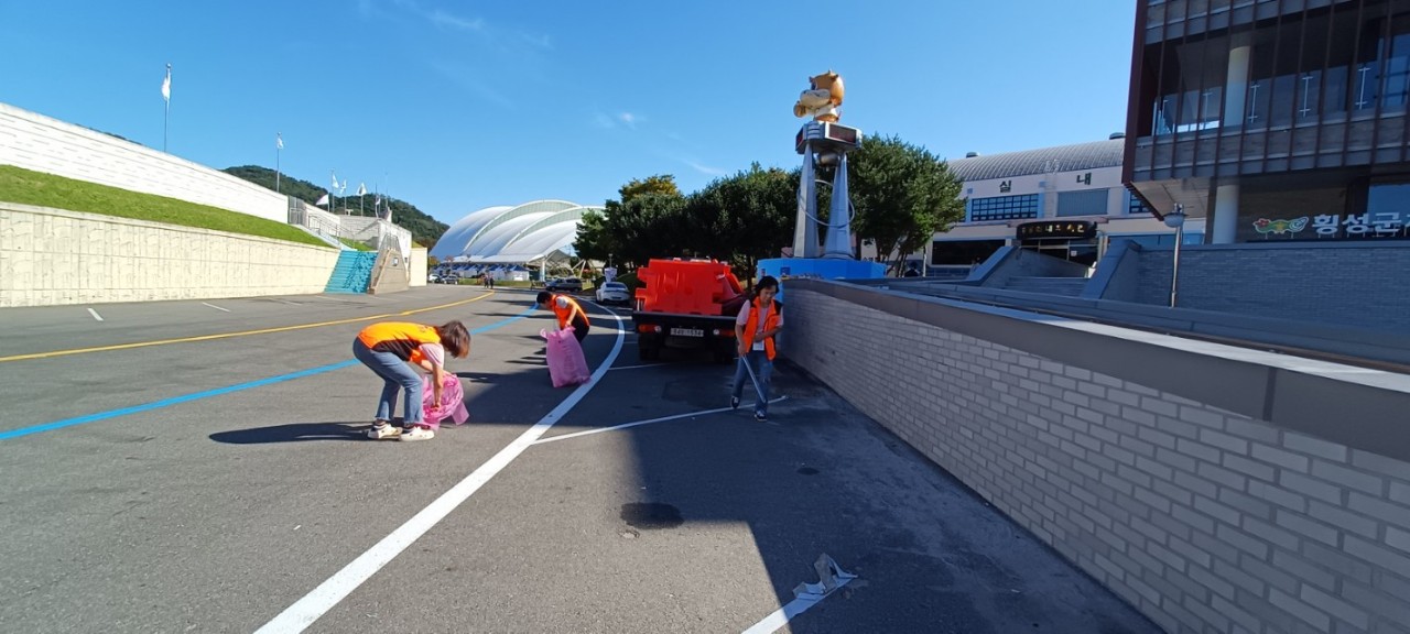 급수 봉사가 끝난 후에는 체육관 주변 환경정화 운동까지!