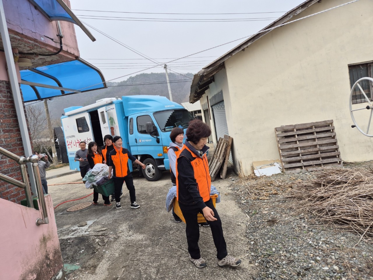 공근여성의용소방대는 3월 25일 오전 10시부터 공근면 청곡1리 마을회관에서 장애인과 노인 등 안전약자를 대상으로 이동세탁 봉사활동을 실시했습니다.