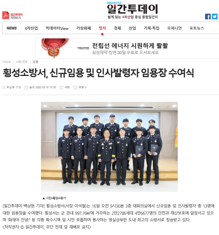 | 2423 | 횡성소방서 신규 임용, 인사발령자 임용장 수여식 | 횡성홍보 | 2020-03-16 | 1059 | |