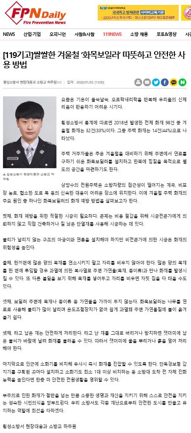 | 2399 | [기고/홍보]쌀쌀한 겨울철 '화목보일러' 따뜻하고 안전한 사용방법 | 예방민원계 | 2020-01-06 | 701 | |