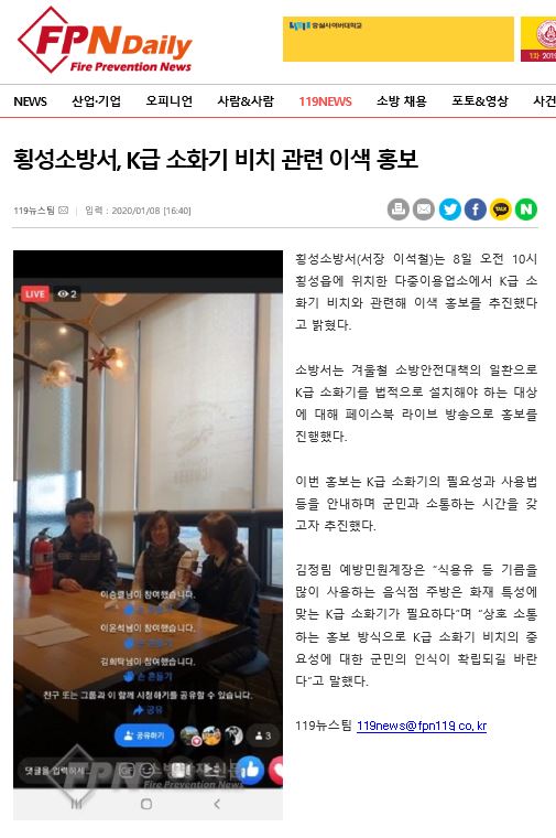 | 2400 | 횡성소방서, K급 소화기 비치 관련 이색 홍보 | 예방민원계 | 2020-01-09 | 675 | |