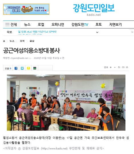 | 2404 | 횡성 공근 여성의용소방대 봉사 | 예방민원계 | 2020-01-27 | 691 | |