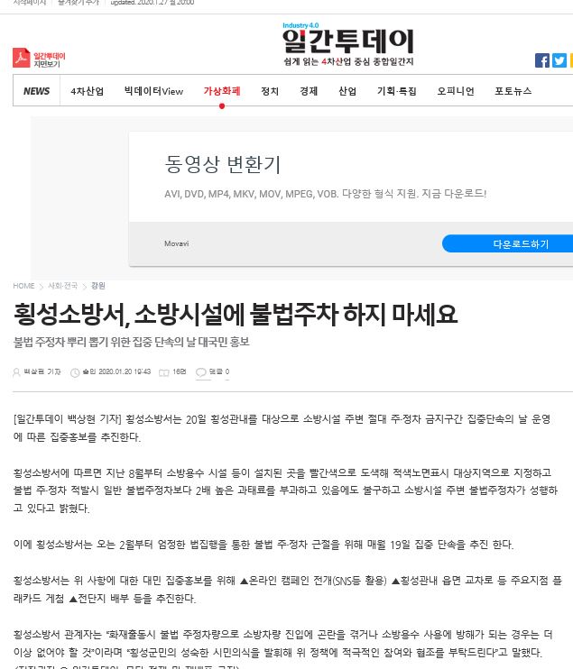 | 2405 | 횡성소방서, 소방시설에 불법주차 하지마세요!!! | 예방민원계 | 2020-01-27 | 682 | |