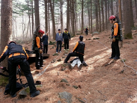 등산객의 증가와 함께 산악사고가 많이 발생하는 계절을 대비한 이번 훈련에는 국립청태산휴양림관리소 직원과 119구조대원 등 20여명이 참여한 가운데, 등·하강기법, 들것을 이용한 요구조자 운반기법, 암벽 및 급경사 접근 구조법, 계곡 고립자 구조를 위한 도하법, 부상환자 응급처치요령 등의 내용으로 진행하였습니다.