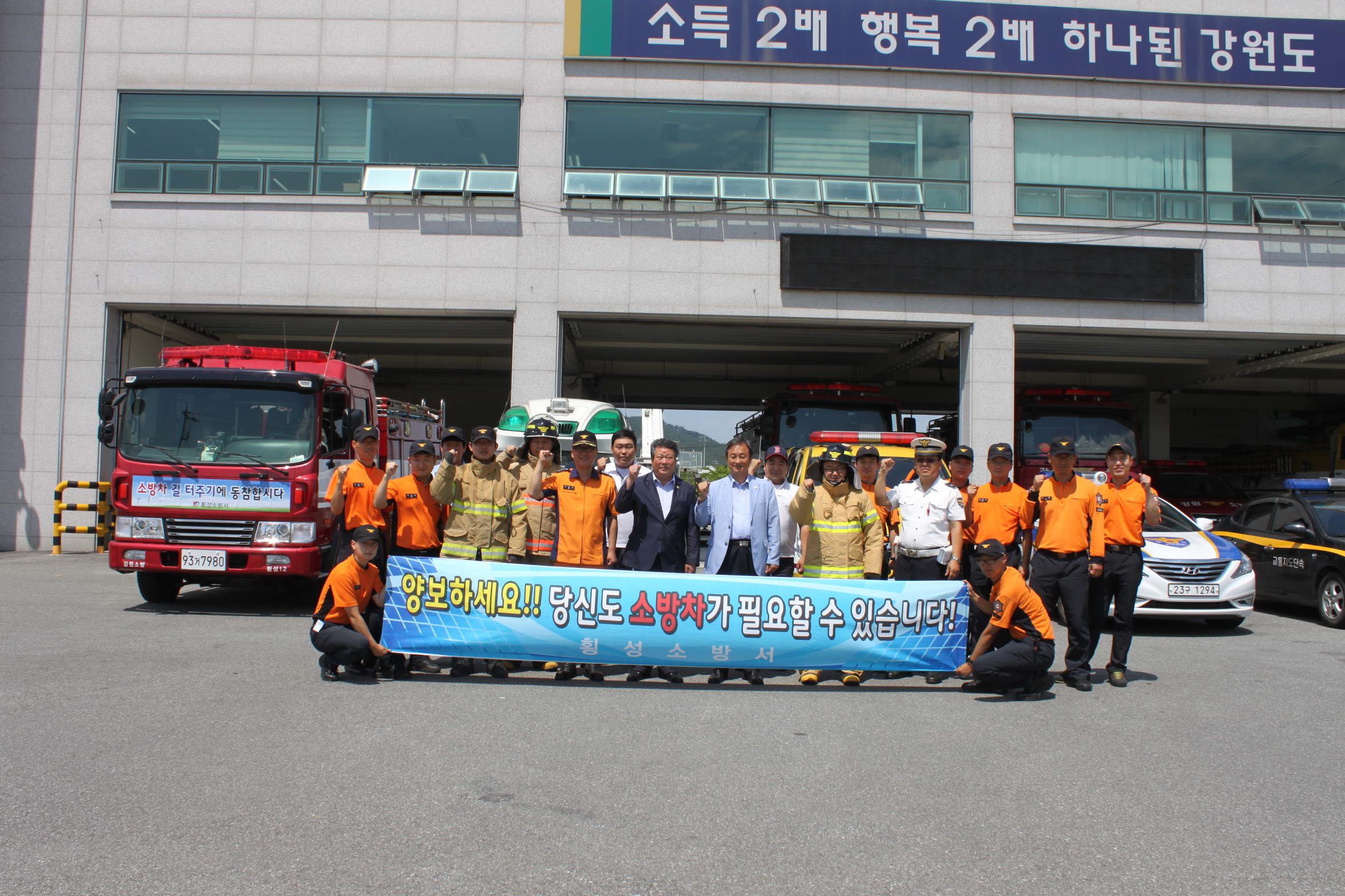 금일 훈련에는 한창수 횡성군의회 의장과 표한상 부의장, 이병은 횡성소방서장이 소방차에 동승하여 횡성시장 및 상습정체 구간에 대한 소방차 길터주기 참여 실태를 점검하고 범군민 공감대 확산을 위한 홍보 활동을 전개하였다.