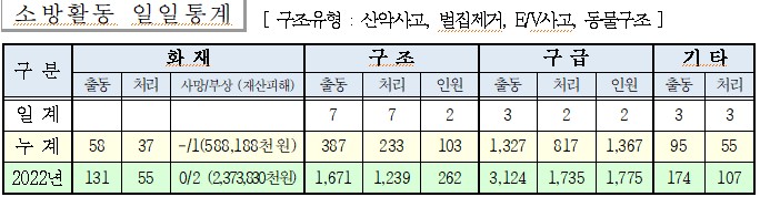 ○ 구조 7건(산악사고 1 , E/V 1, 교통사고 1, 벌집3, 기타안전사고1)