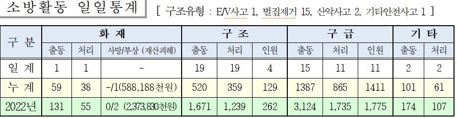 ○ 구조 19건( E/V사고 1, 산악사고 2, 벌집 15, 기타안전사고 1 )