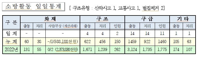 ○ 구조 4건(산악 1, 교통사고 1, 벌집제거2)