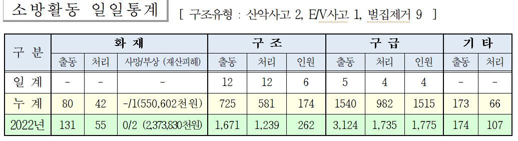 ○ 구조 12건(산악사고 2, E/V사고1, 벌집 9, )