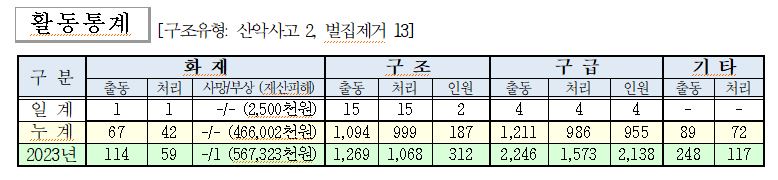 ○ 구조 15건(산악사고 2, 벌집제거 13)