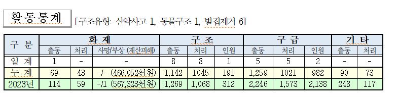 ○ 구조 8건(산악사고 1, 동물구조 1, 벌집제거 6)